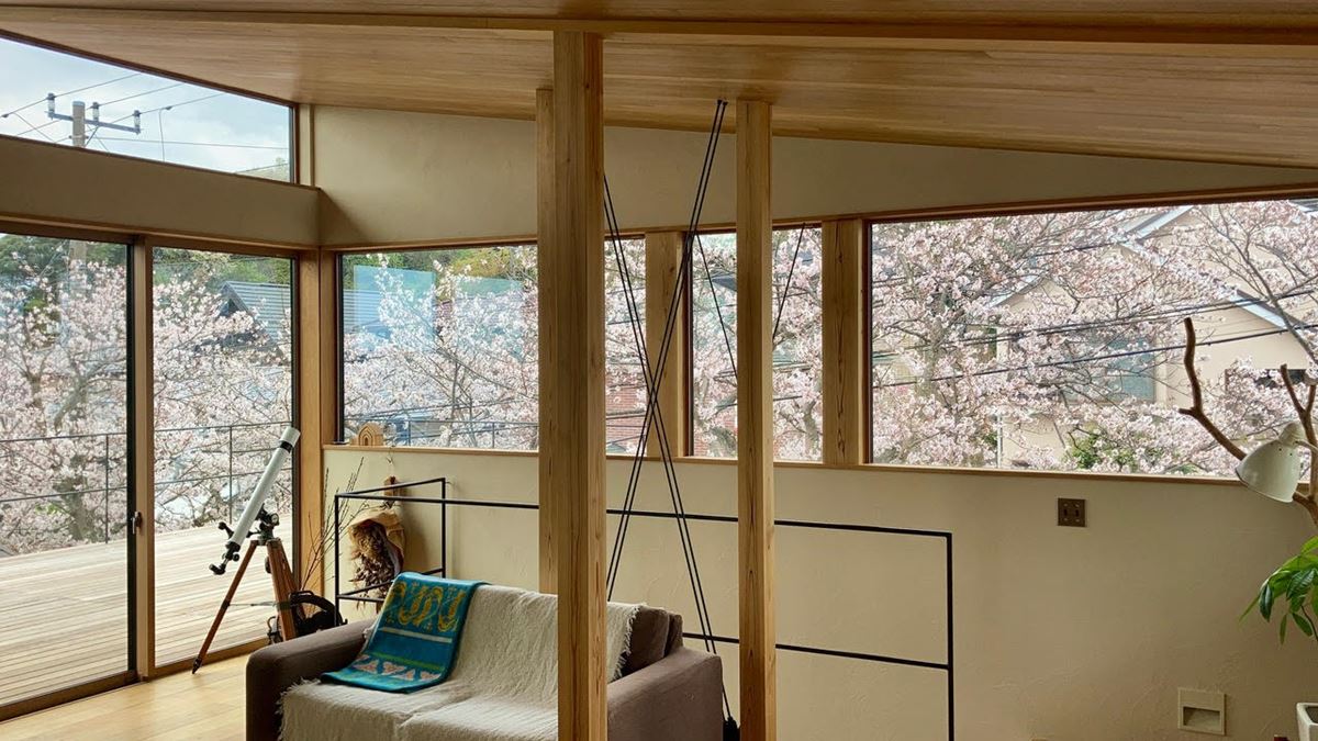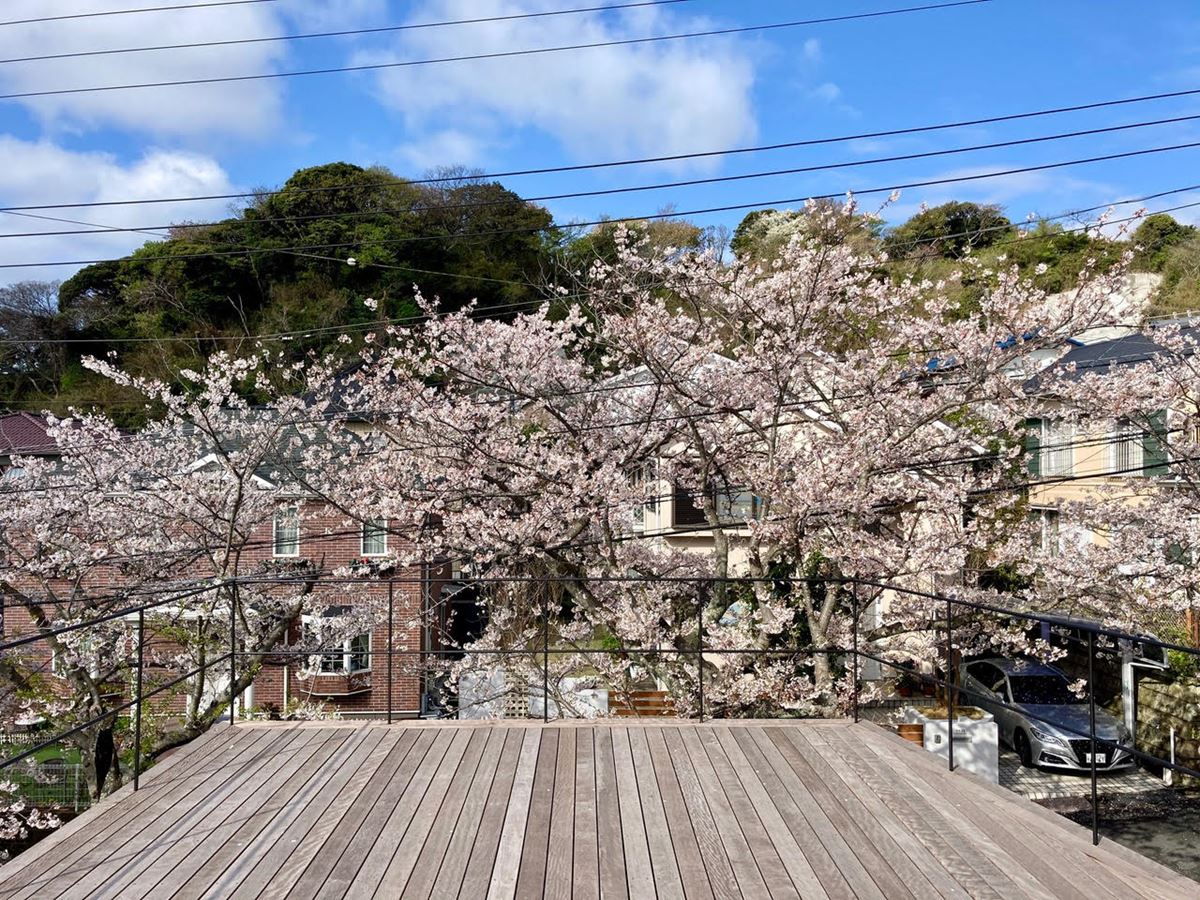 青々とした緑の時期もいいですが、なんといってもお花見シーズンが素晴らしくて。窓がピンク色に染まって最高でした。桜並木側に大きく窓を作っていただいて、本当によかったです。