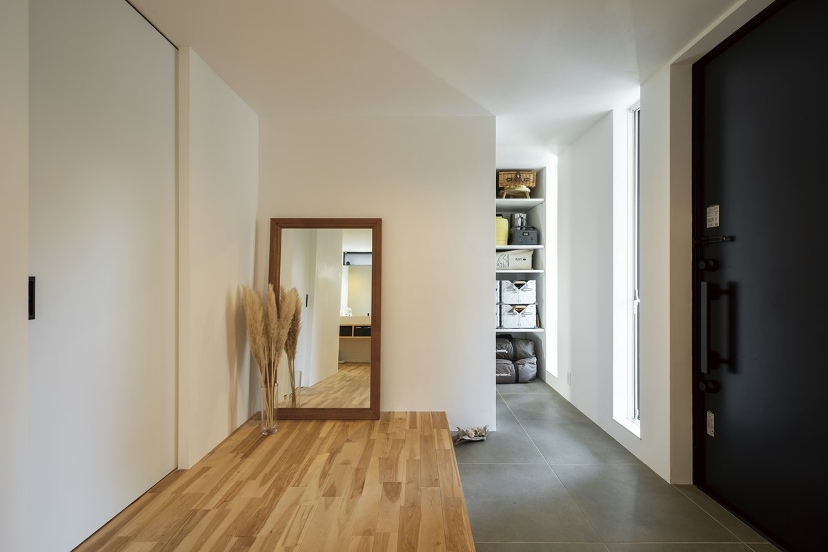 ゆったりとした広さの玄関には、シューズインクローゼットを設け、靴だけでなく、真冬のアウトドアも快適に過ごせるほど充実したキャンプ道具がすべて収まっている。