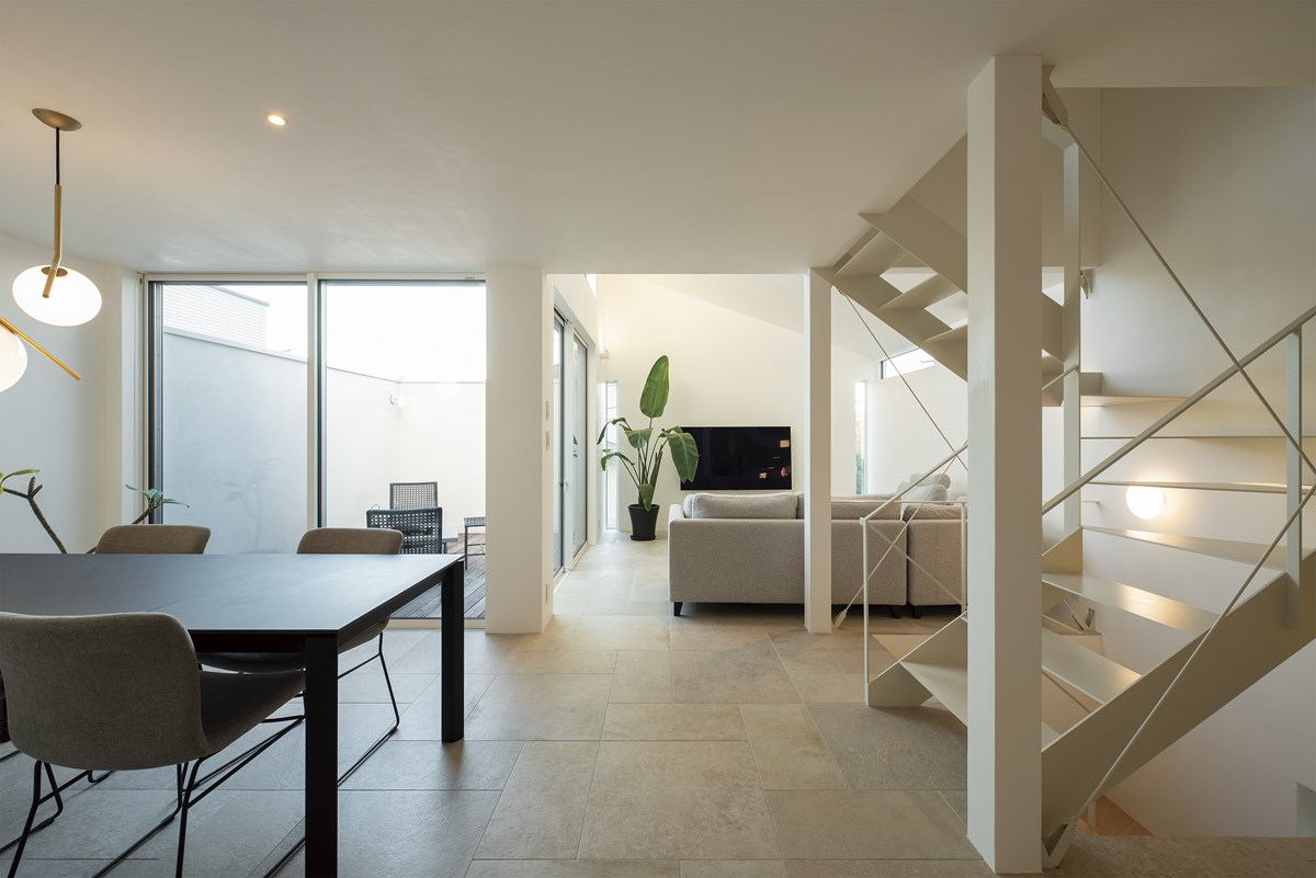 LDKは2階に配置。ダイニングとリビングを拡張するようにバルコニーを配置し、視覚的な広がりを出した。バルコニーは壁に囲まれているため、外部からの視線は気にならず、室内の延長のように使える空間に。「バルコニーに面した窓だけでなく、どの窓も外からの視線が入らないように工夫されているので、カーテンは一枚もつけていません」
