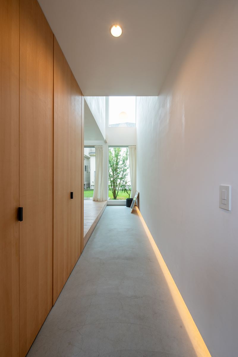 光と陰、開放感と包み込まれるような居心地のよさが存在する家族の居場所。リビングの窓外に設けたデッキや玄関から続く土間が家の内と外をつなぐ中間領域のようなスペースになっている。