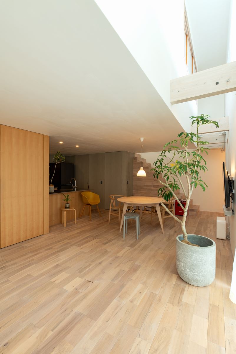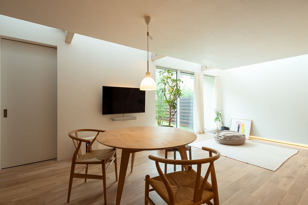 吹抜け以外の天井をあえて少し低く設定したリビング・ダイニングは、落ち着いた居心地のよい空間になりました。天井面を美しく見せるためにダウンライトは最小限に抑えて、吹抜けの梁にスポットライトを設置しました。生活のシーンに合わせて明るさを調節できるので、暗いなと感じることもなく、室内の陰影を楽しんでいます。