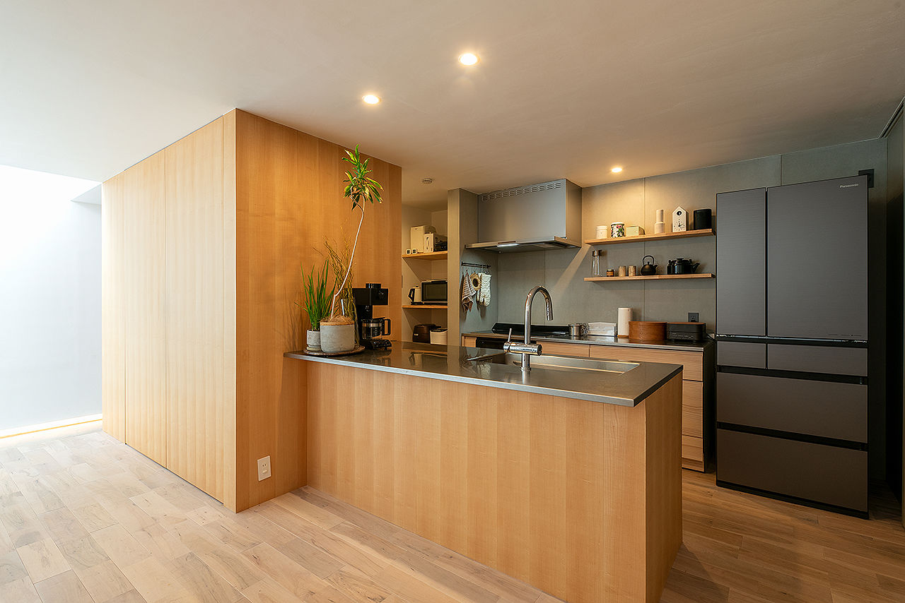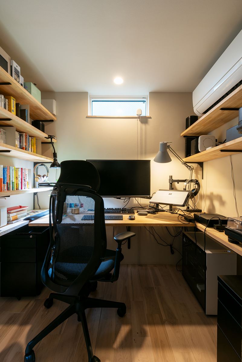 在宅勤務も多いので、キッチンの隣に配置されているワークスペースは、コックピットのように整えられた程よい広さで、仕事に集中できる空間になりました。扉を閉めてしまうと、そこに部屋があると気づきにくい隠れ家のような場所です。