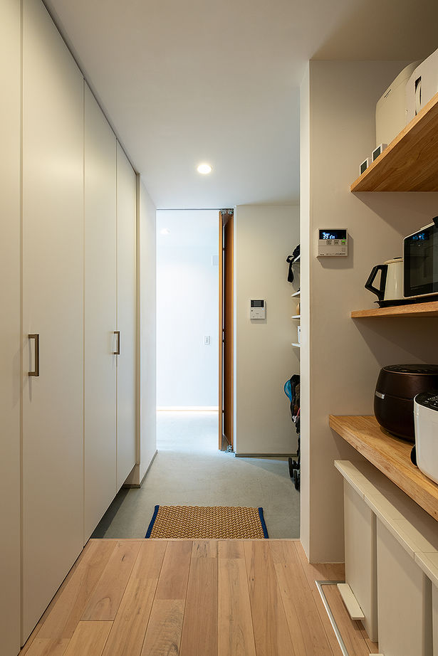 「いろいろな素材が混在するのではなく、素材ごとに塊感のあるデザインで見せたい」という要望を受け、LDKは白を基調とした空間の中にボリューム感のある木の塊、コンクリートのような質感を持つフレキシブルボードの塊などが点在する空間に。キッチンと隣り合う大きな木の箱は、パントリー収納とリビング収納を一体化したスペース。リビング側の収納の扉は天井までのフルハイトドアになっているため、壁面のように見えてすっきりした空間デザインを損なわないよう配慮されている。