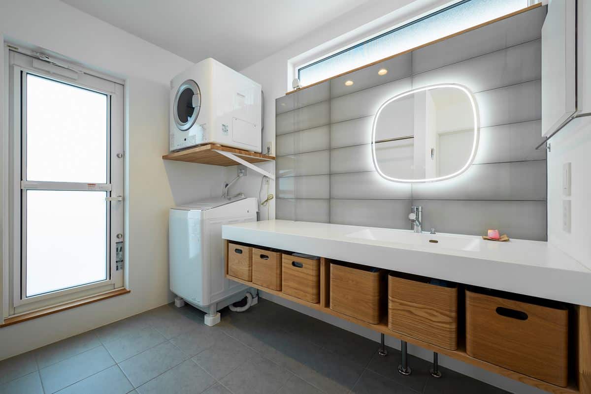 洗面脱衣室はランドリールームも兼ねている。毎日着る服はここに置いているので、洗濯・乾燥・収納が1か所で完結する便利さ。