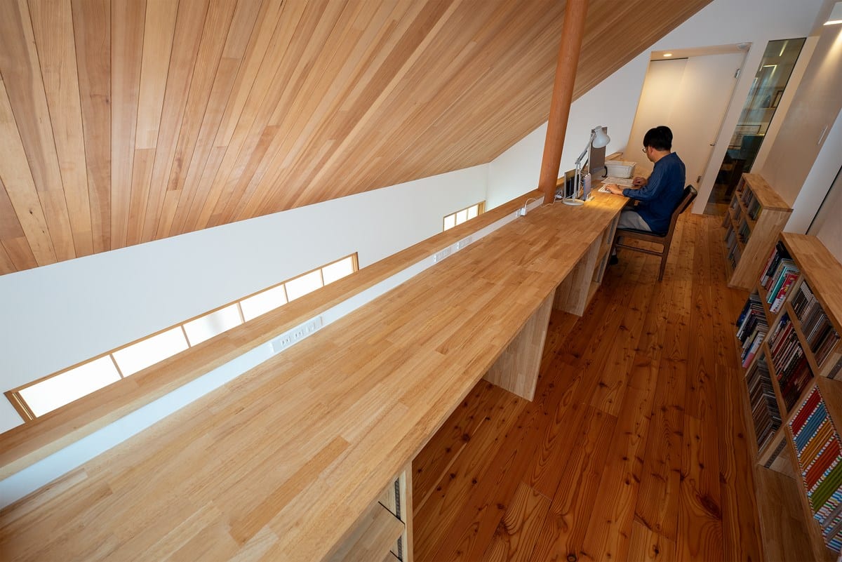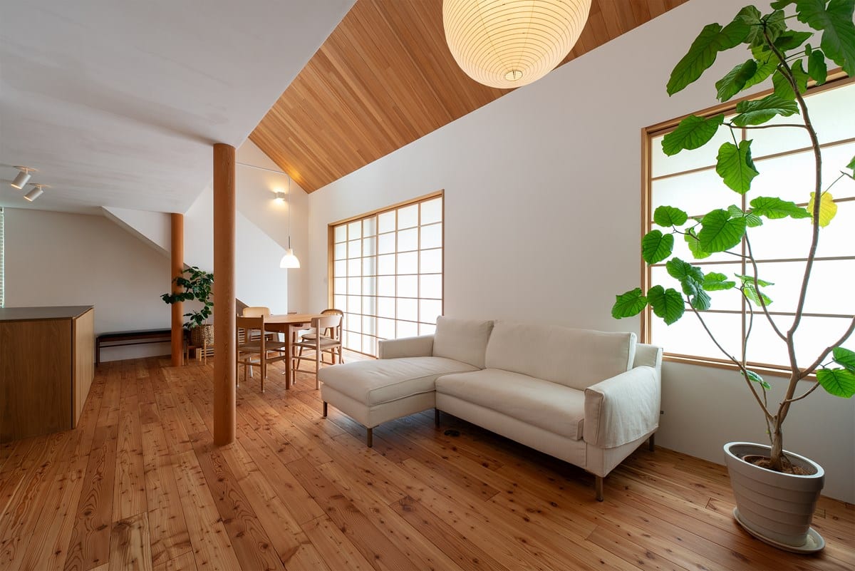 障子は見た目にすっきりしているだけでなく断熱性もあって、すごく気に入っています。 漆喰の壁と勾配天井をなんとなく日々眺めては、いい家だなと感じています。