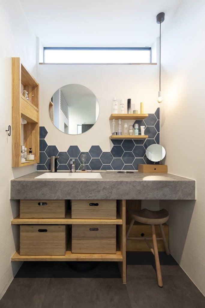 造作のニッチやタイルの配置はこだわりました。椅子も収納できちゃいます♪