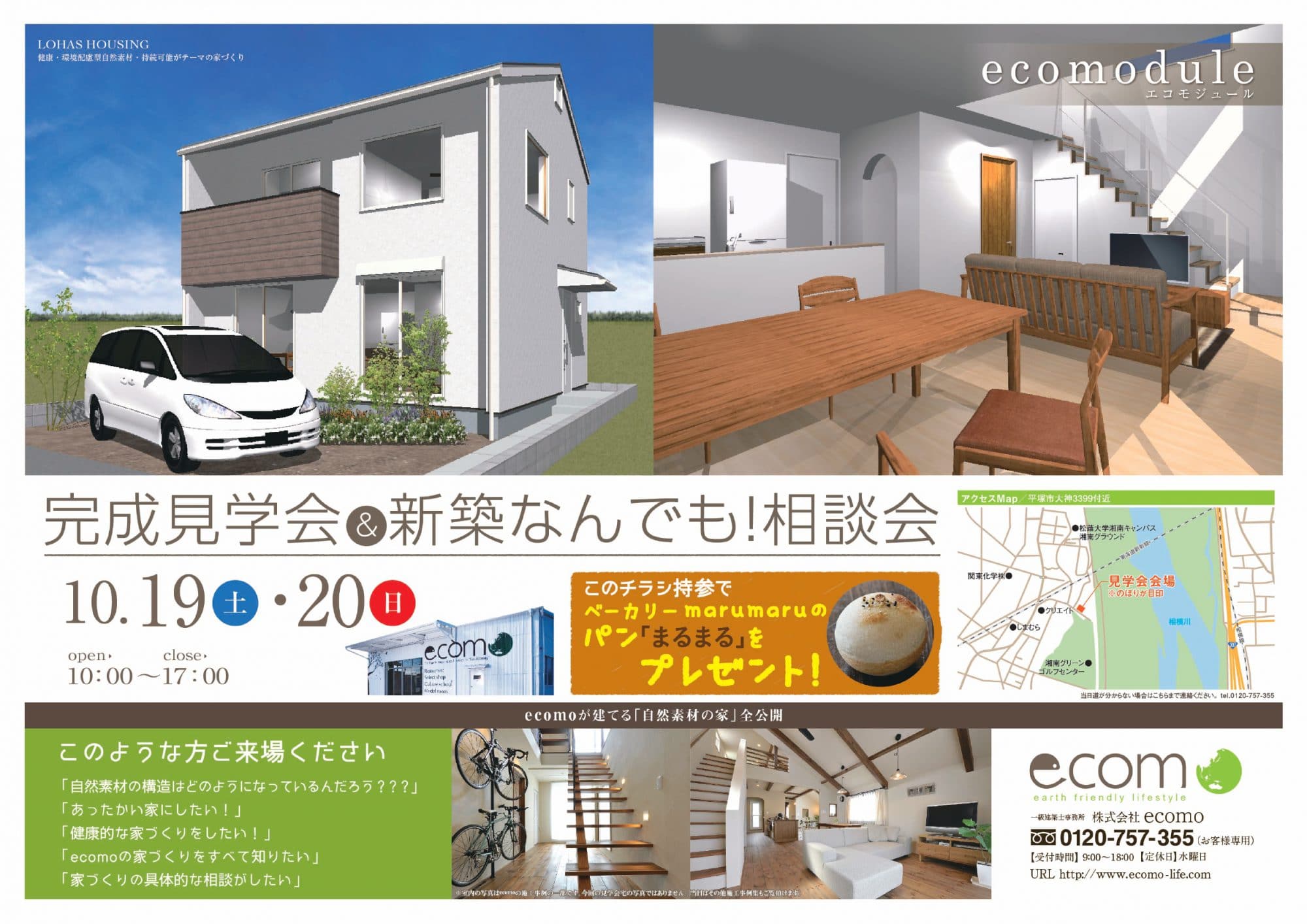 メール info@ecomo-life.com 件名に「見学会来場希望」と ご記入下さい。