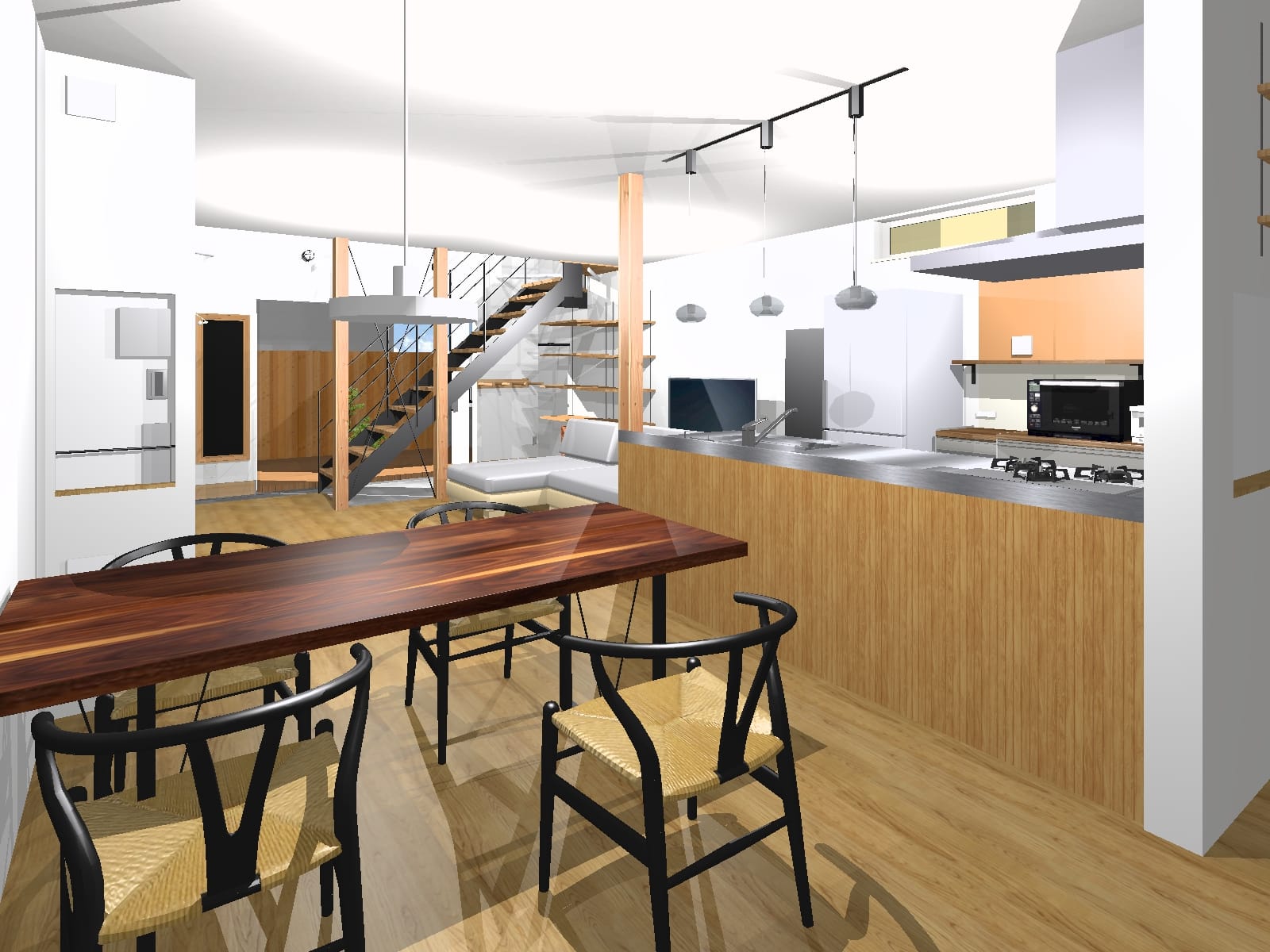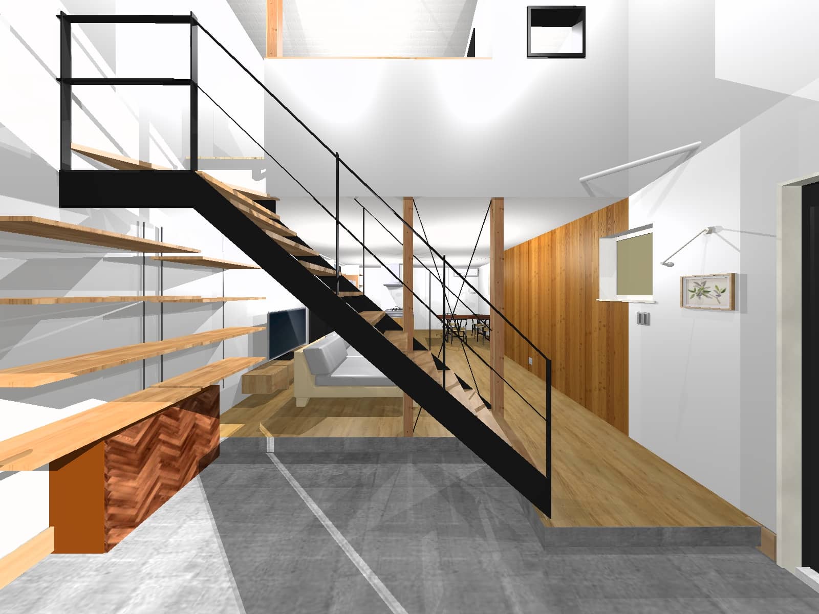 土間、鉄骨階段、ウッドデッキ、吹き抜けなどなど。