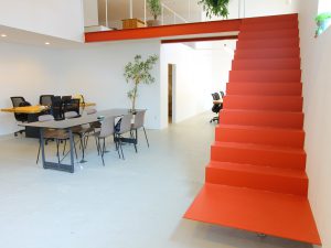 1人1台のタブレット・スマホ・PCを貸与。社内もフリーアドレスとしています。