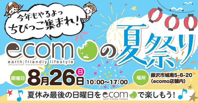 8月26日(日)ecomoの夏祭り開催決定!! ecomoの夏祭り開催決定!!夏休み最後の日曜日を ecomoで楽しもう♪ 開催日 8月26日(日) 10時~17時場 所 藤沢市城南5-6-20 (ecomo店舗内) ちびっこ木工教室 ゲームなど 楽しい 楽し~い企画を 検討中です!!いろいろ決まり次第 こちらのイベント情報にUPしていきますので、チェックをお願いします。
