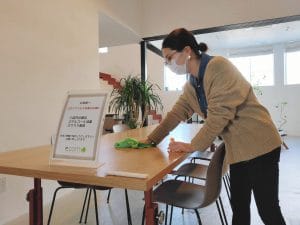 - 店舗内のテーブルはもちろん、お客様が座る椅子の除菌・消毒を実施。