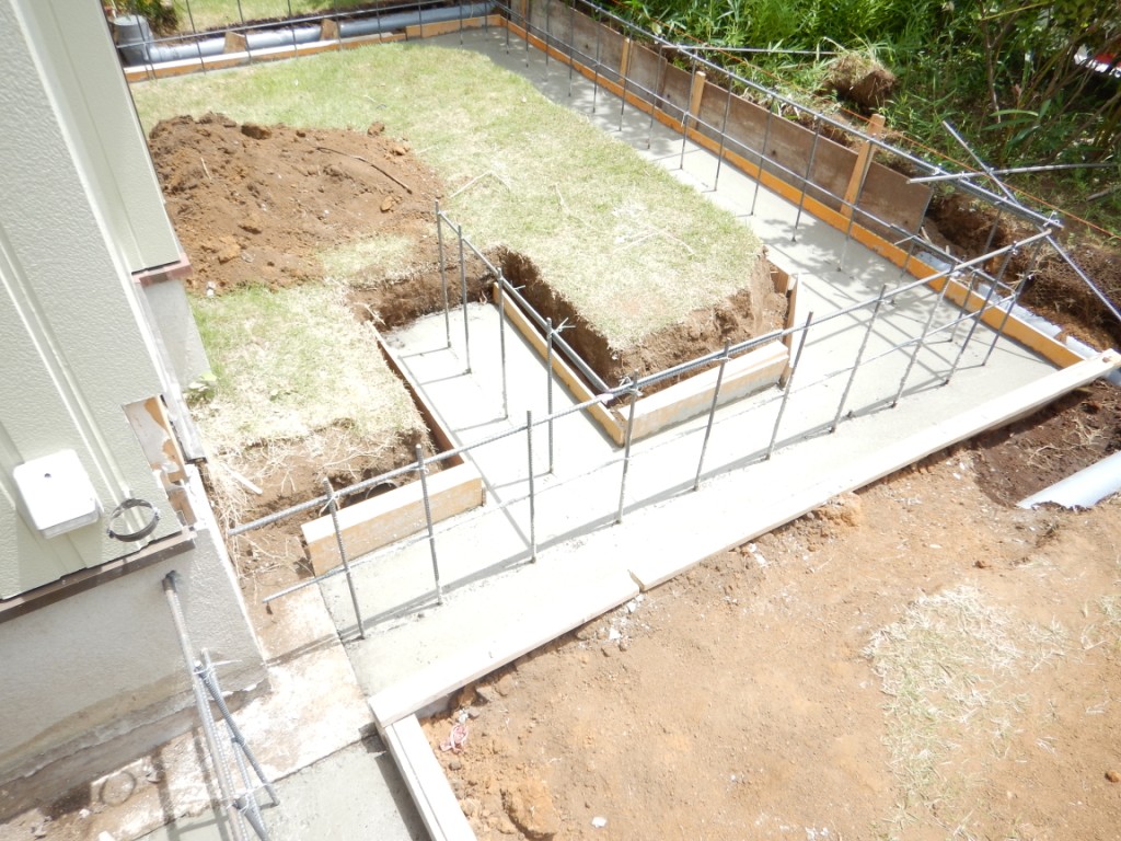 藤沢市で増築工事が始まりました。既存基礎に合わせ、鉄筋布基礎に防湿コンクリート打ち!