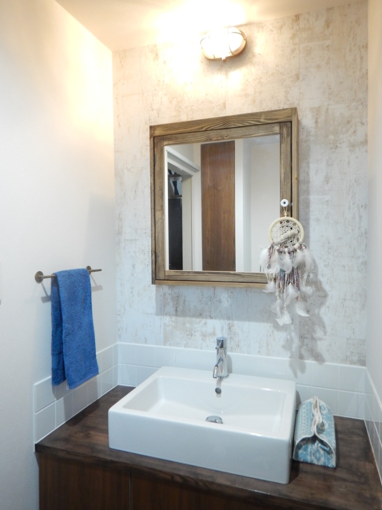 ミラーキャビネットは、無垢でできたIKEAの商品を、お客様施工で塗装していただきました。