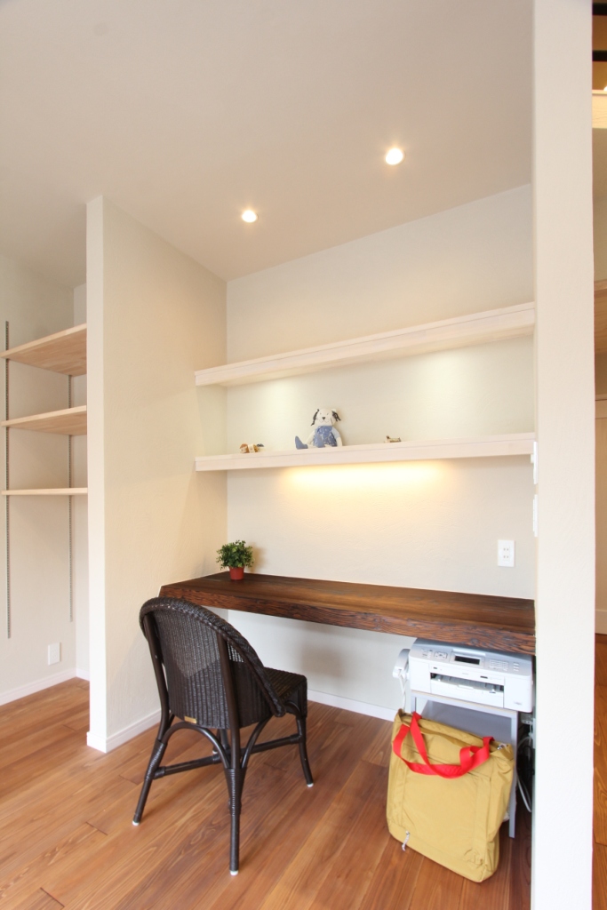 リビングに設けたパソコンコーナー、土佐杉の焼き杉一枚物カウンターがカッコいい。