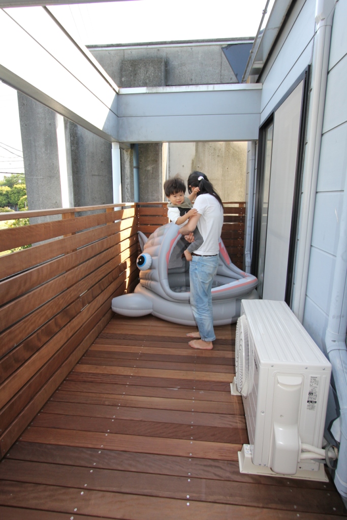 広いベランダにウッドデッキとフェンスを造りました。巨大なプールも無事置けた!