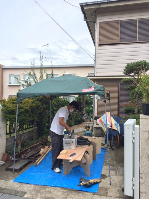 この日も1日大雨の予想ですが、翌日ユニットバスのメーカー施工が予定されていたので、何としても大工さんに作業してもらわねばなりません。もちろん在宅ですので、お部屋の中では作業場所も限界があるので、これが役に立ちます。