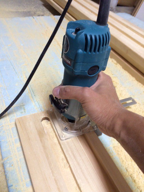 ①集成材に「トリマー」を使って二本の溝を入れます。