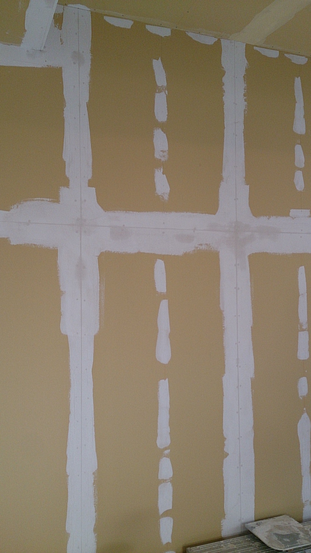 この下地処理は非常に重要な作業で、ボードの継ぎ目やビス打ち部分や表面全体の処理になり、仕上げ工事よりも手間が掛かります。