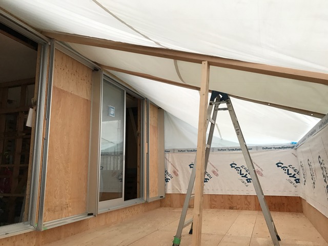 朝から屋根材を剥がして、床を作るために新しく梁を入れたり、床下地を作ったり、10時前にはこの状態。