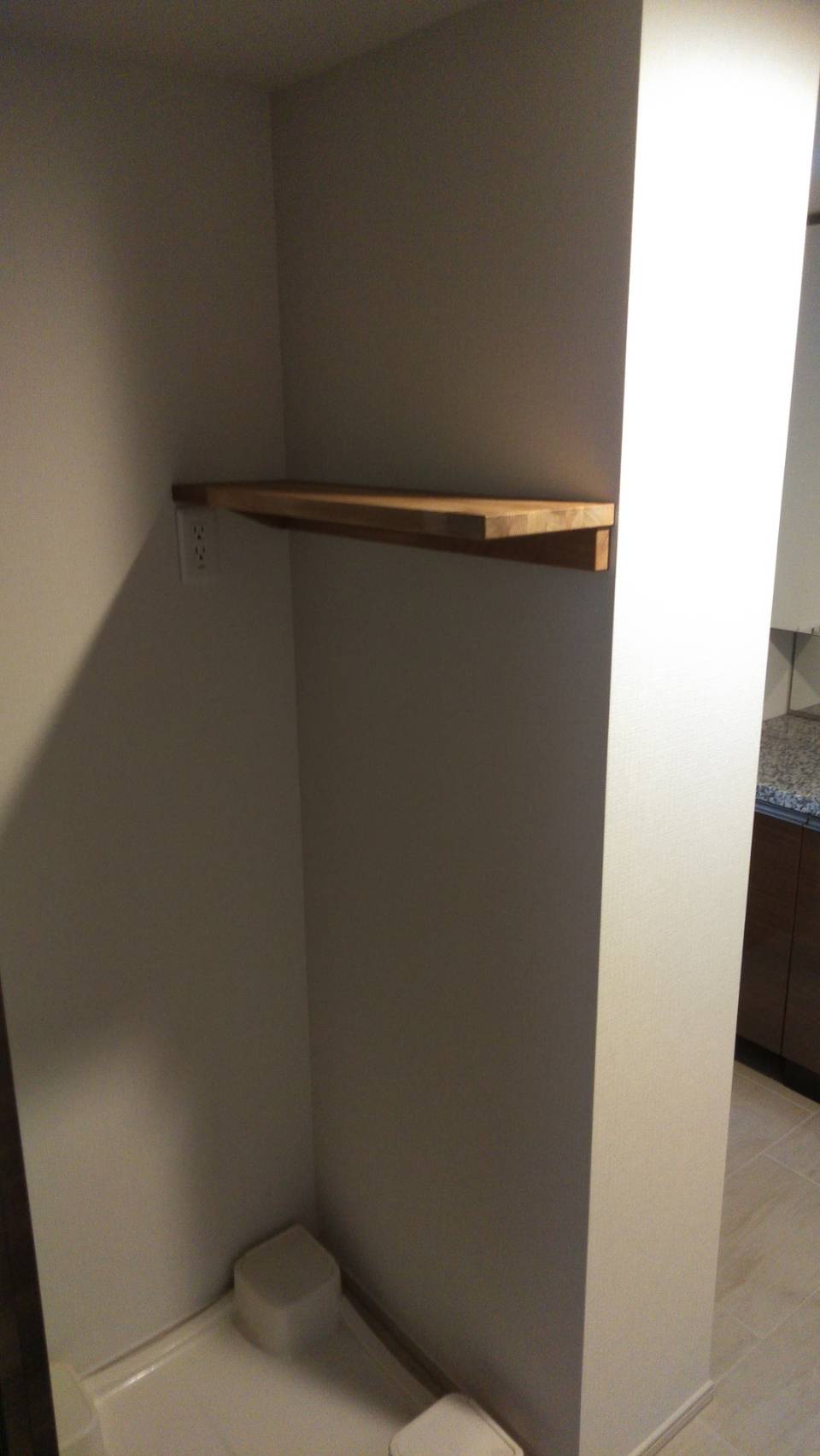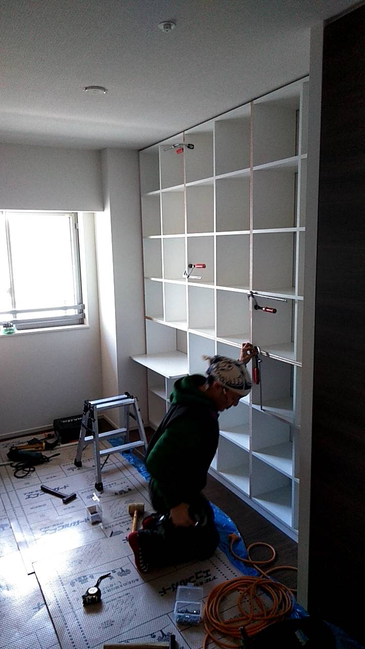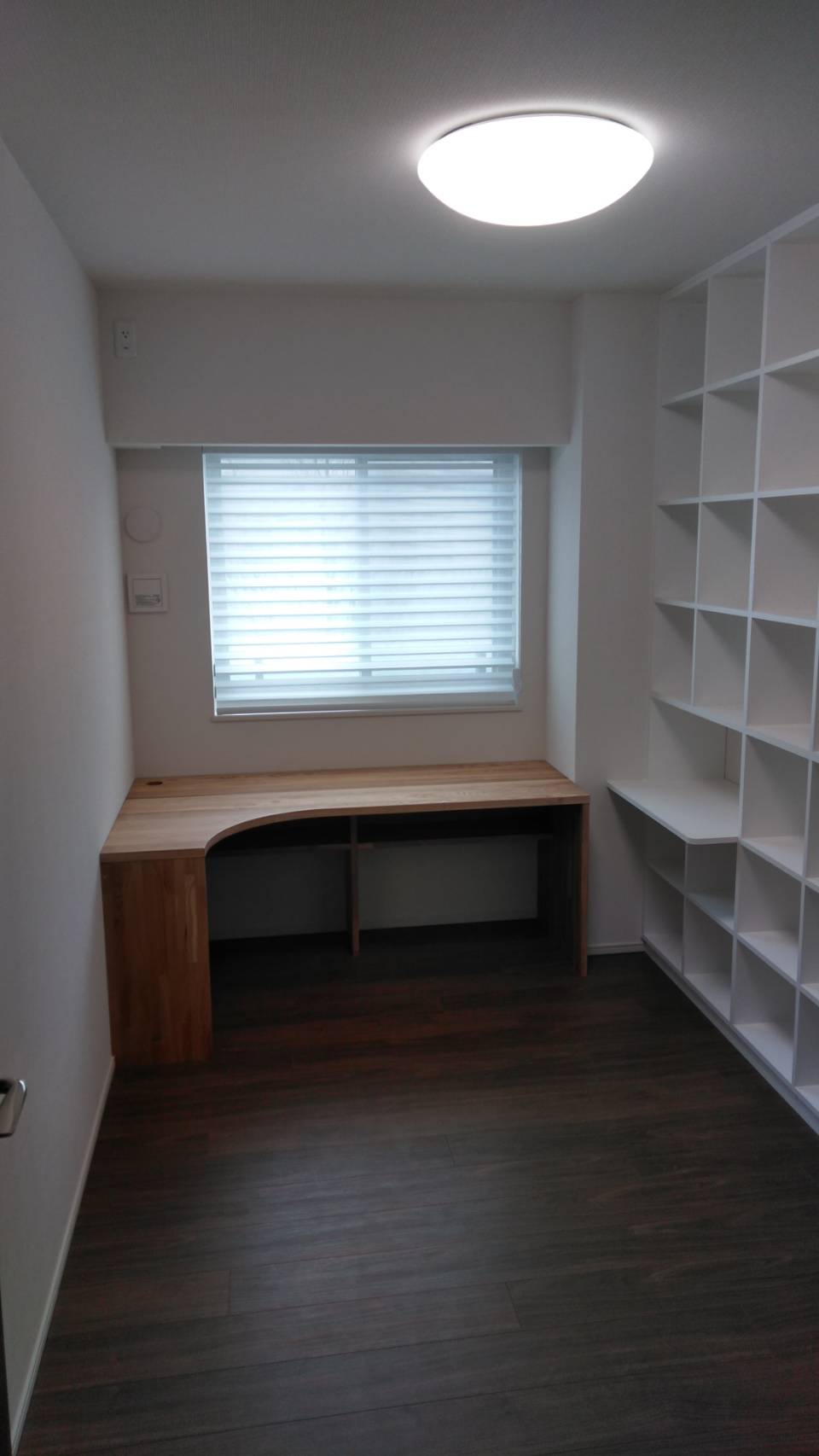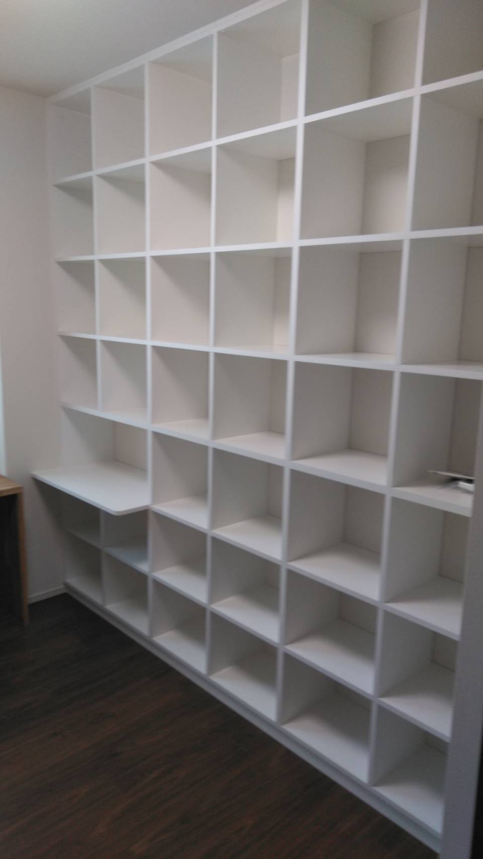 白い棚にある茶色い板はプリンターを置くのに少し出っ張らせよう!と話していたものです。