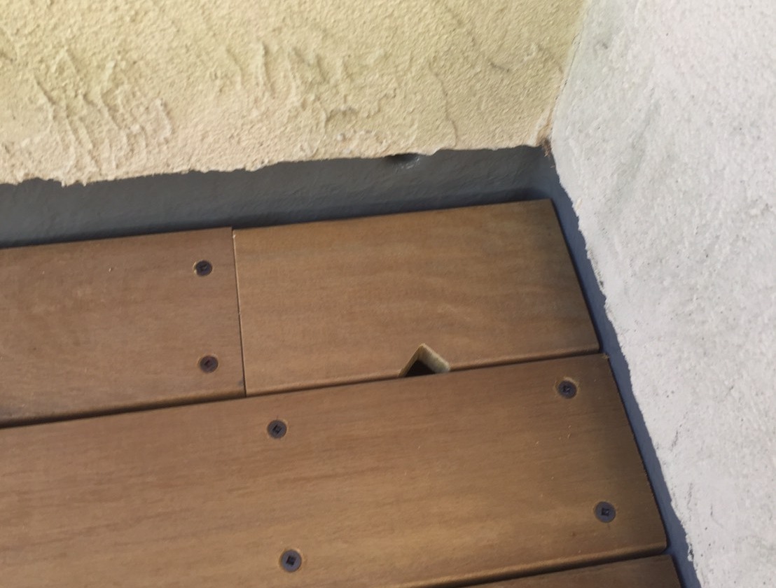 Rのあるベランダ、解体した床材を型紙代わりに使ってカットしていた職人でした。