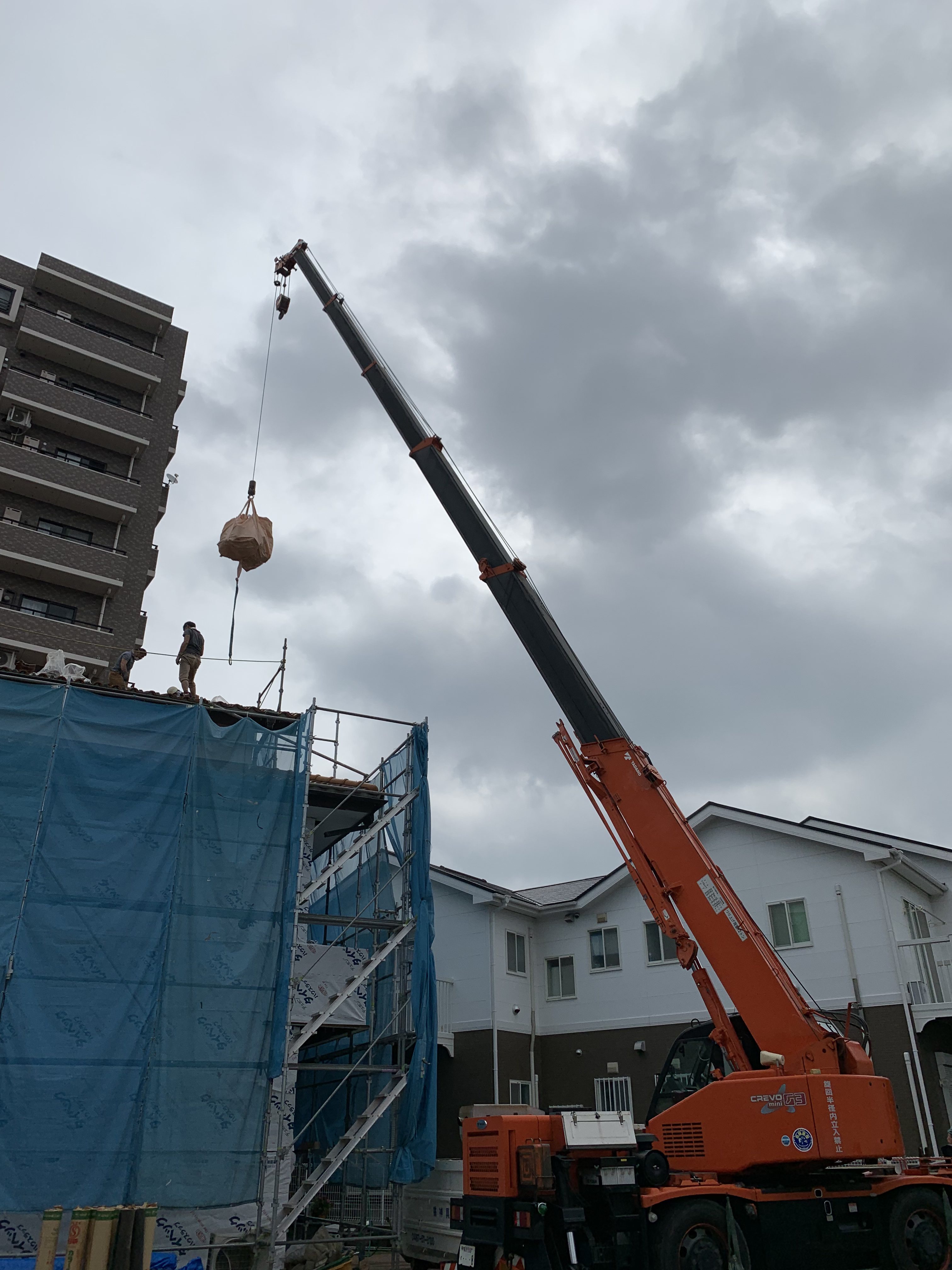 現場の敷地に恵まれてるので、レッカー登場です。お陰様で捗りました〜。