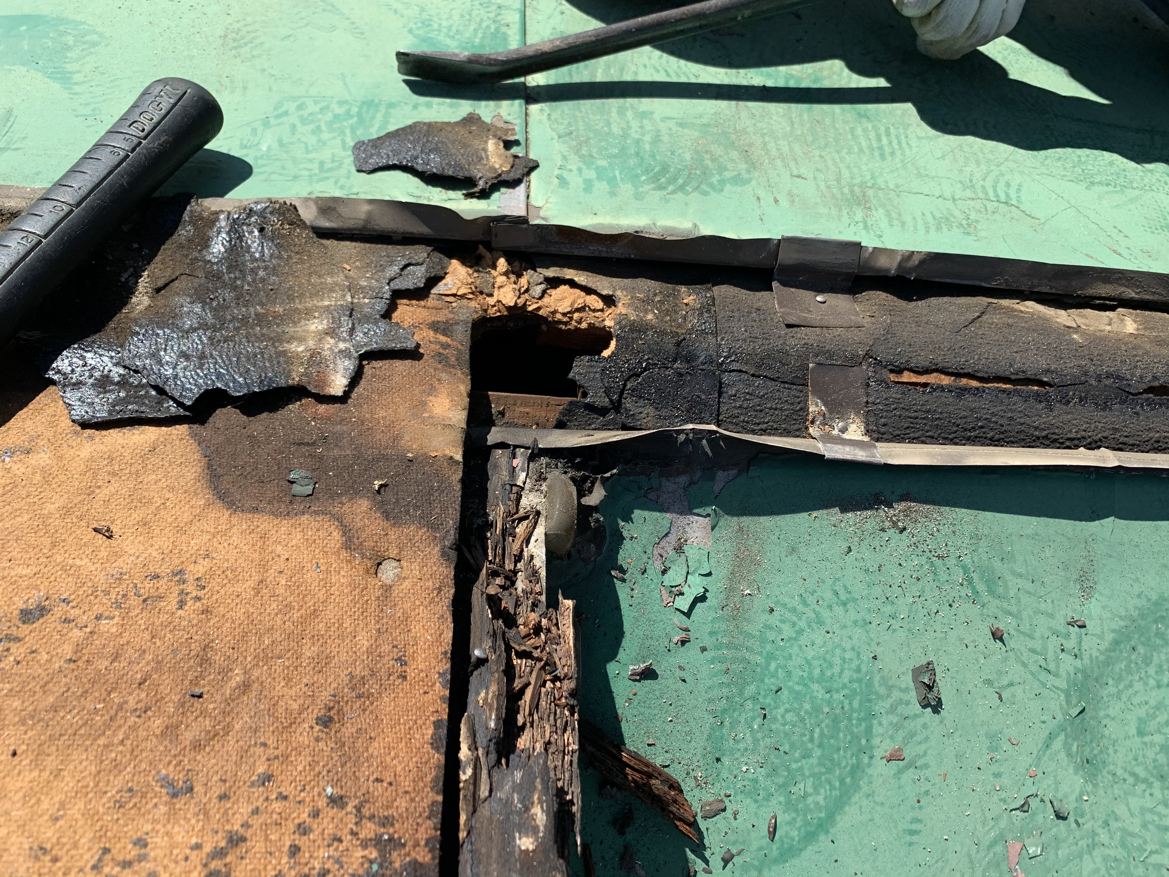 屋根の仕上げ材をめくると、防水紙の劣化から屋根下地材が腐食し穴が数カ所発見されました。ここから屋根裏・天井へ雨が漏れたという事が確定されました。