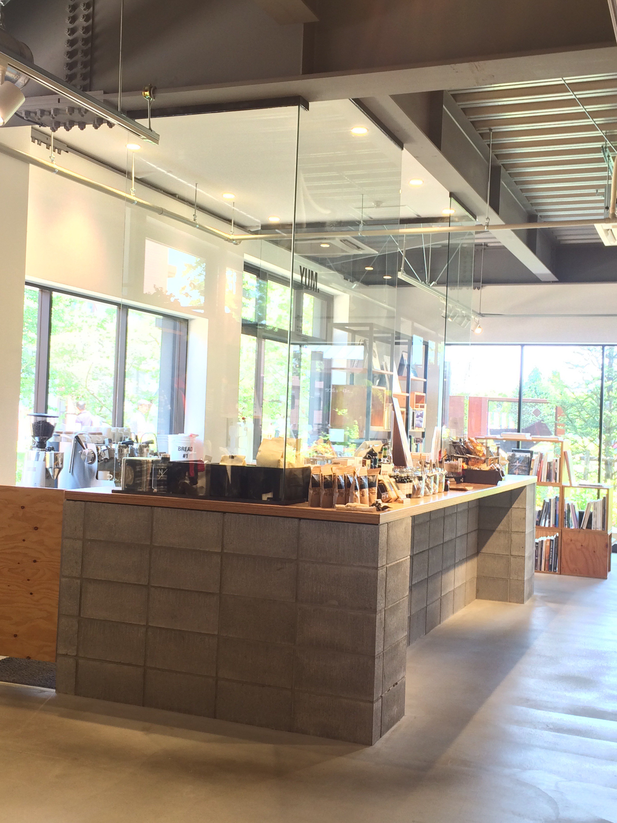店内のカフェカウンターが、以前ecomoベーカリーで作ったブロックを使ったカウンターと同じ感じでした。