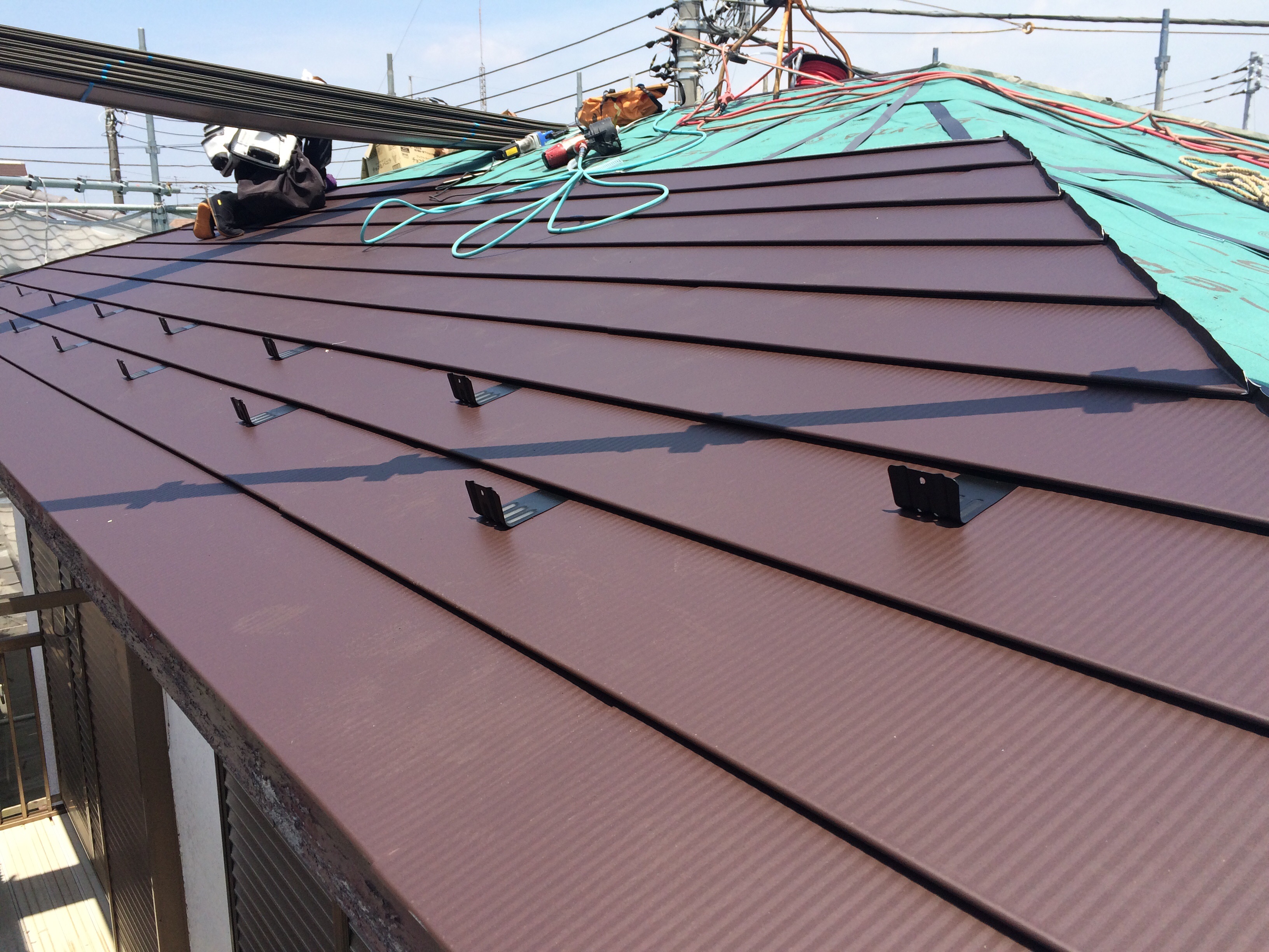 ただでさえ暑いのに、屋根材は素手で触ると火傷するくらいまで暑くなるのでもちろん手袋に長袖、屋根上作業だからヘルメット、本当頭が下がります。