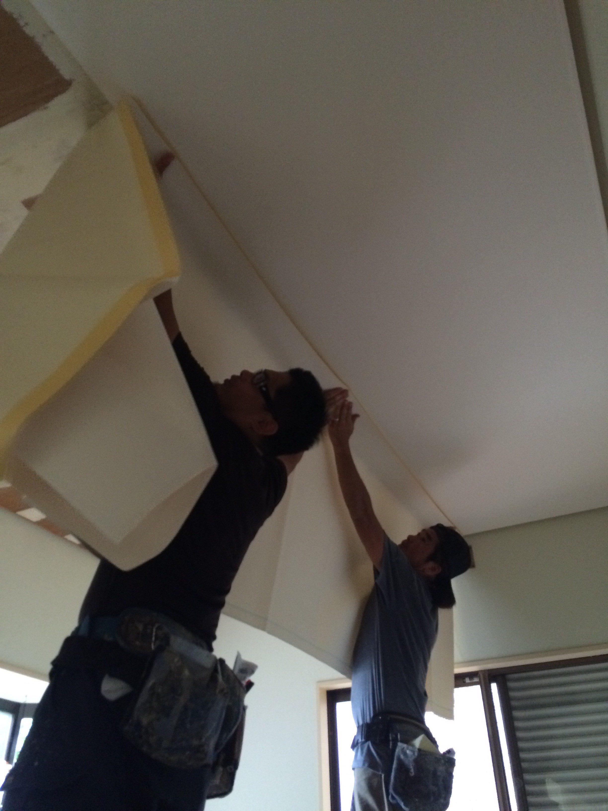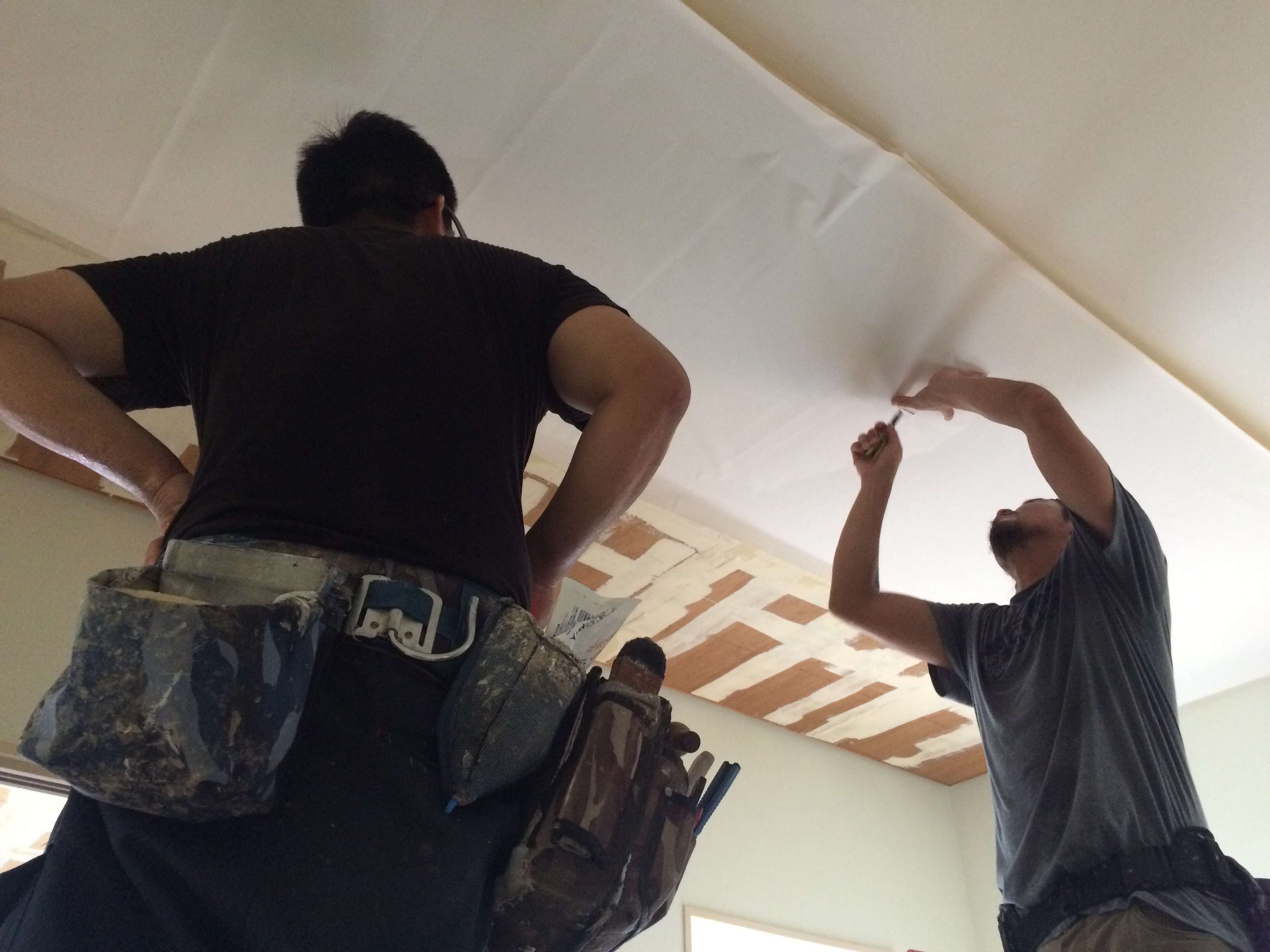 今回はクロス屋さん、天井のクロスを貼る時などは、同時に1枚のクロスを2人で貼ります。「いっせーのーせっ」と聞こえてきそうなこの作業、長く一緒にいると自然と息が合ってくるのでしょうか、、、。