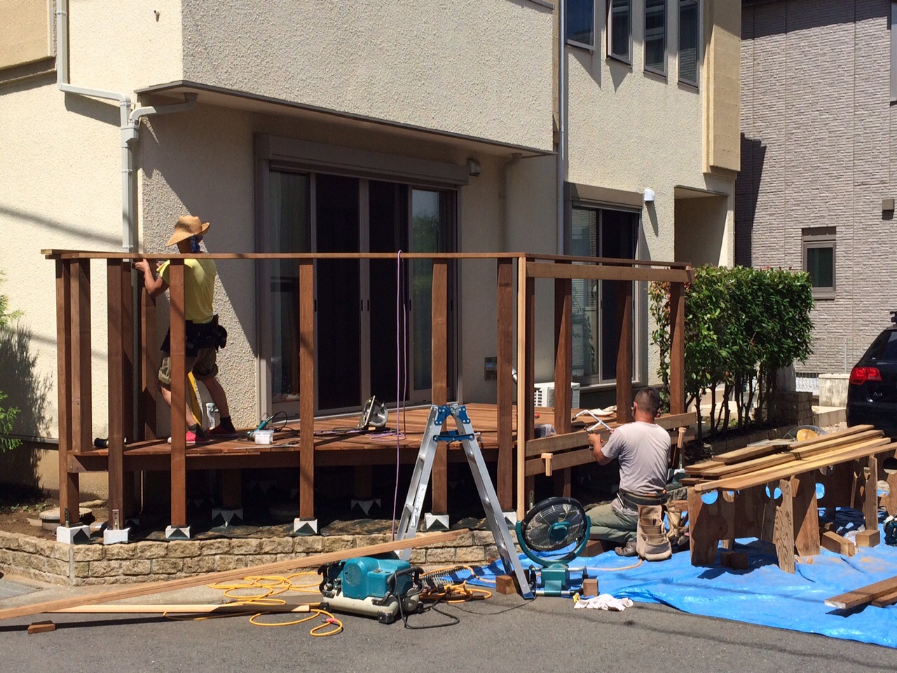 本日は快晴なり 監督の鈴木です。 梅雨が明けた途端、刺すような陽射しと突然の雨に職人さん達も振り回されっぱなしです。 今日はウッドデッキ作ってます! 扇風機を持ち込んで、、、 ん??麦わら帽子??? 相当涼しいらしいです。日本の夏ですね〜 Facebook で共有するにはクリックしてください (新しいウィンドウで開きます)クリックして Twitter で共有 (新しいウィンドウで開きます)