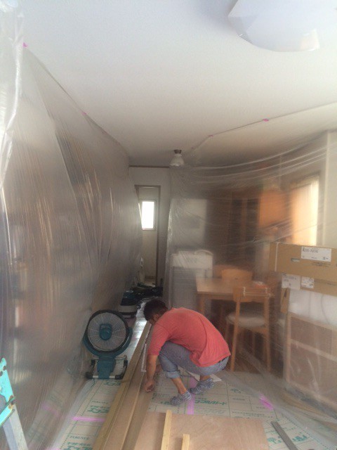 題して「鈴木スペシャルカーテン養生」、天井にタッカー床にテープで留めます。