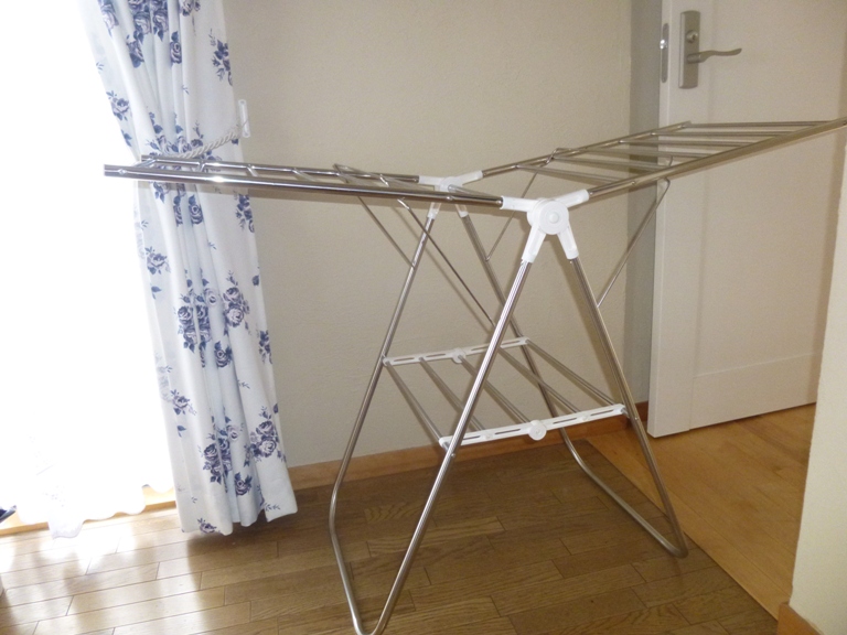 面倒くさがりな私は、湿度が低い日には夜のうちにニットなどの陰干し用の洗濯をして、寝室においてある平干し用のタオル掛けに干してから、室内を暖めるためにエアコンをつけます。