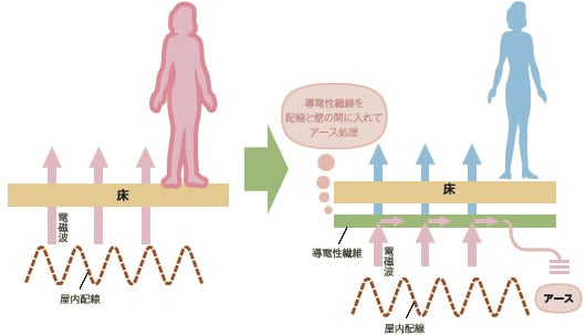 オールアース住宅とは、導電性シートを使って、建物から発生する電磁波(電場)をカットした住宅です。