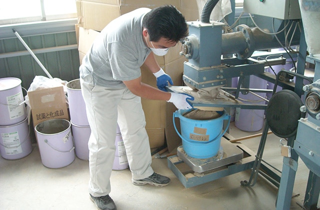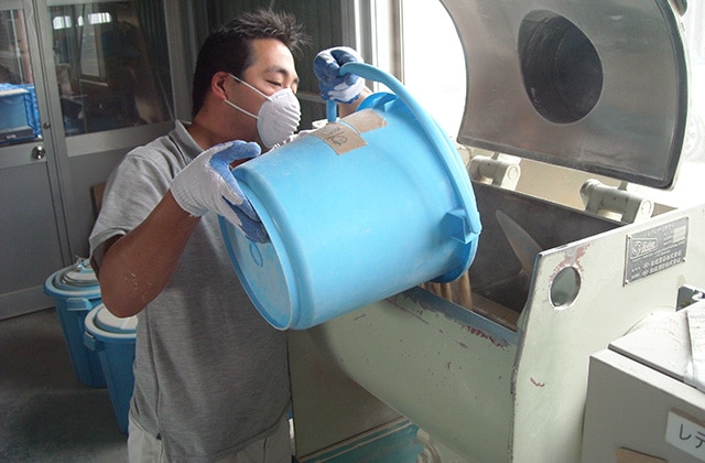 北海道の工場で砕いた珪藻土とセルローズ、デンプン糊、白土を攪拌させながら