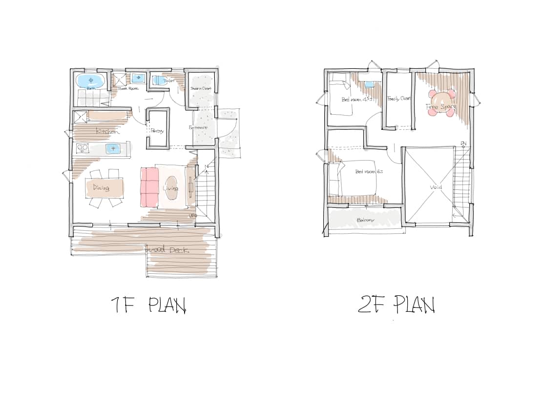 皆様ご希望の多い3LDK、吹き抜け、土間収納、パントリー、回遊動線が含まれており、基本を抑えた使いやすい間取りです。