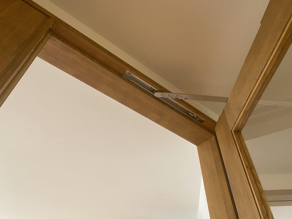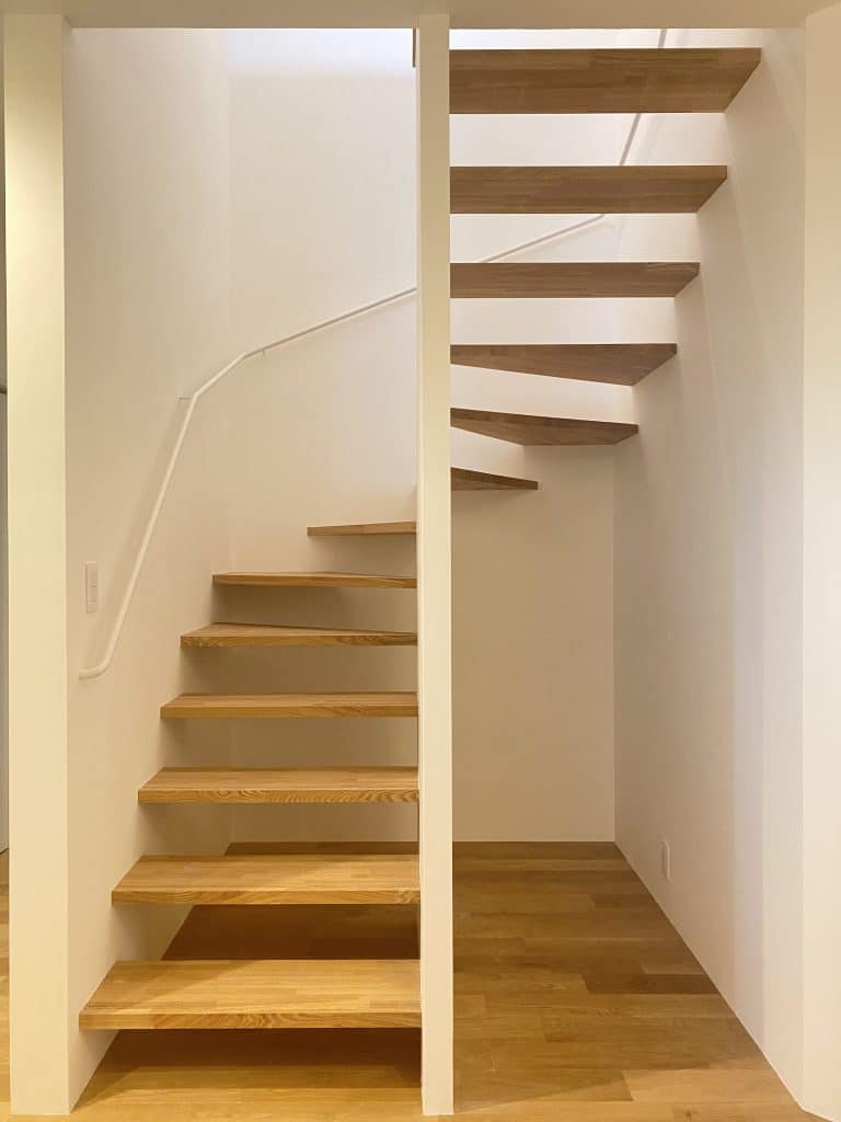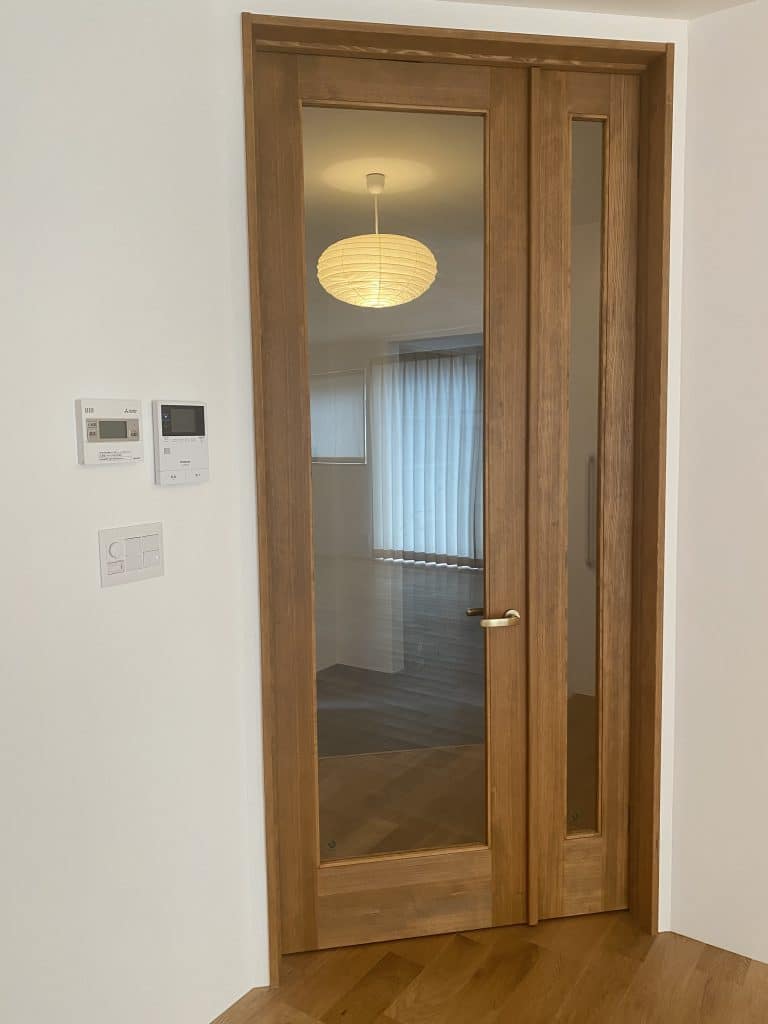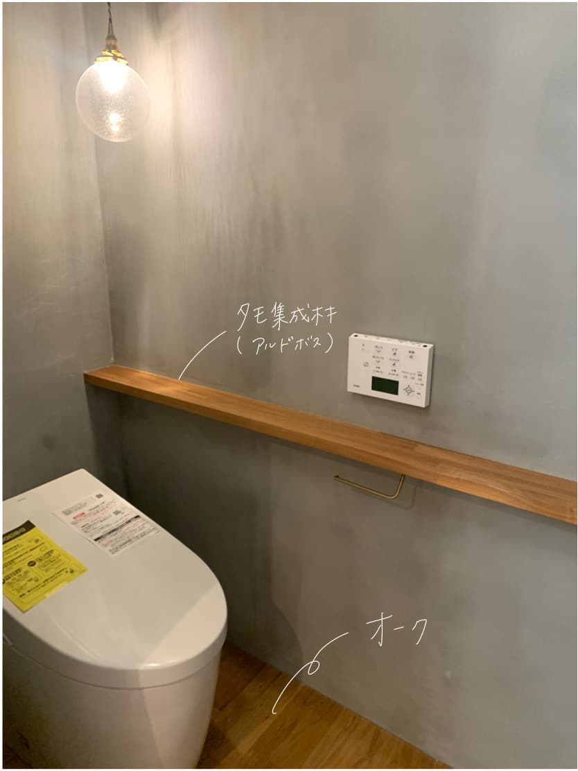 床材がオークの時、造作材はゴム集成材やタモ集成材を使用し、塗装はアルドボス。