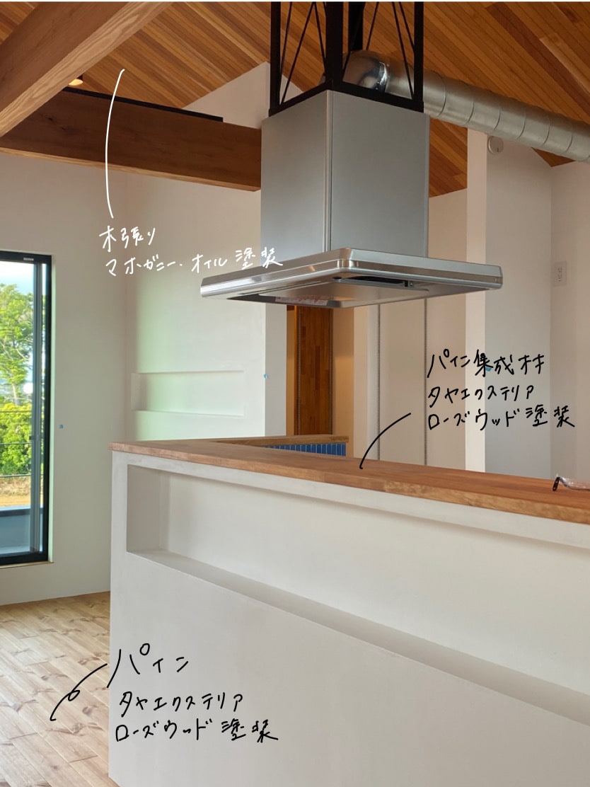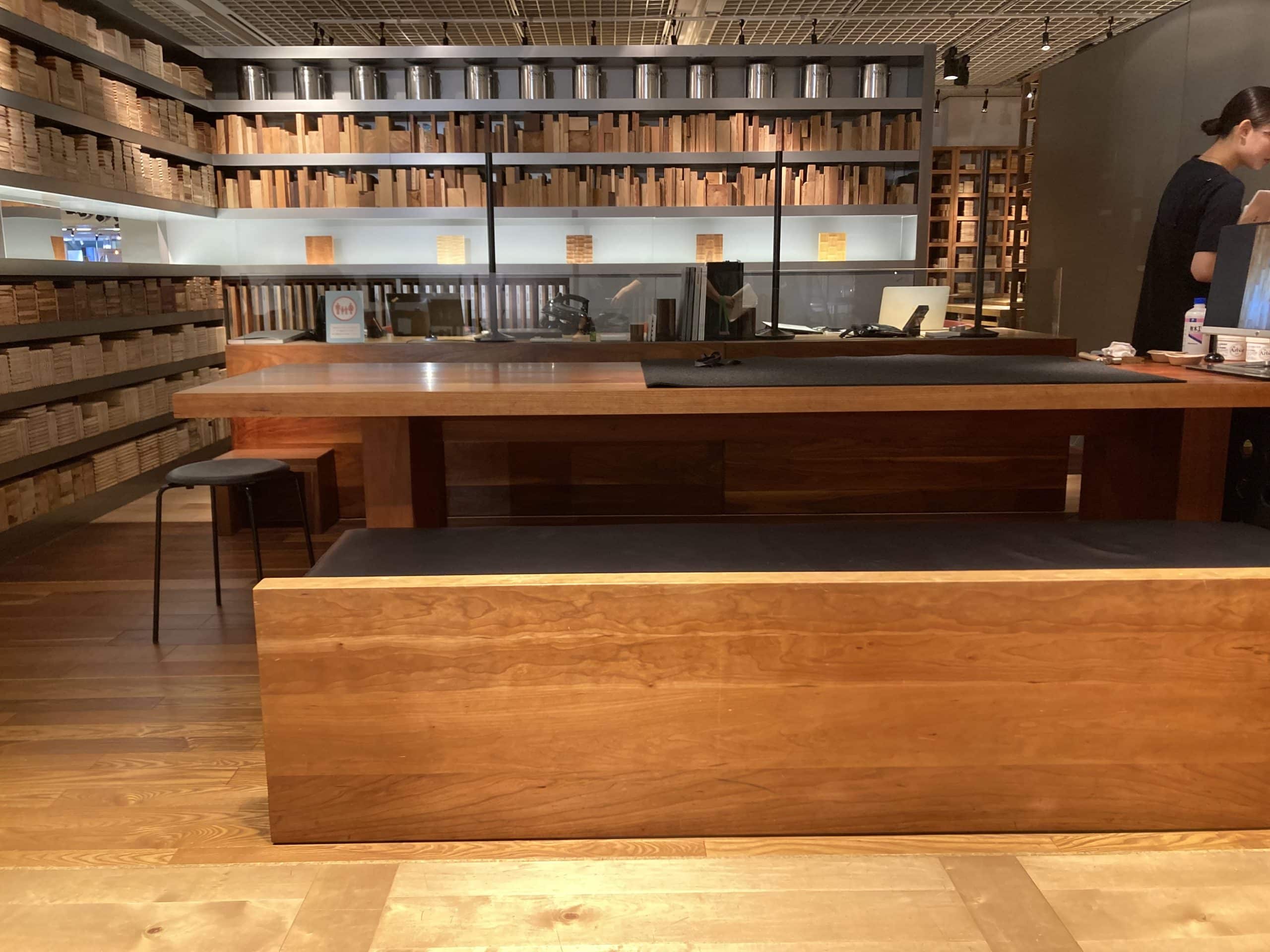 造作材はゴム集成材で床材に合わせ塗装しています。