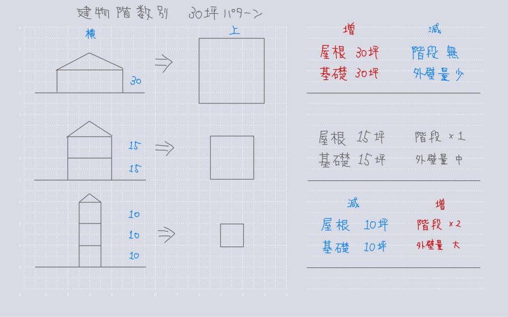 そうなると上の②からの流れもあるのですが、同じ延床の2階建てでも