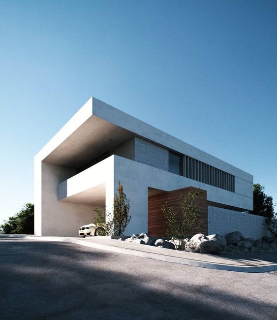フレームで跳ね出した屋根やバルコニーにガレージと