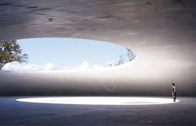 豊島美術館は、広さ約40×60m、最高高さ4.3mの空間に柱が1本もないコンクリート・シェル構造で、天井にある2箇所の開口部から、周囲の風、音、光を内部に直接取り込み、自然と建物が呼応する有機的な空間です。