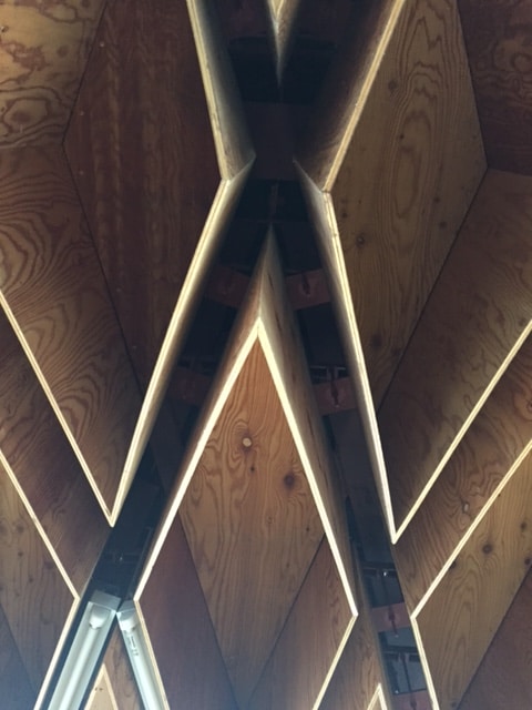 菱形のみ、割と安価な素材のみ、ですがそれぞれの辺に高さの変化をつけるだけで、面白い空間になっています