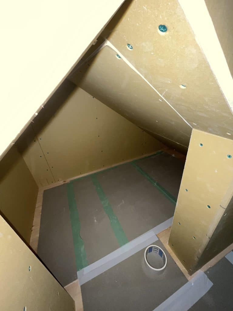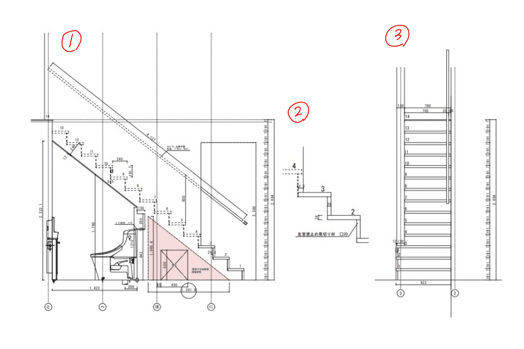 ①の図面(断面図)にあるピンクに塗られている範囲が階段下収納になります。お客様よりできるだけ大きな収納が欲しいというご要望があったので、あえて図面では細かい寸法は指示していません。