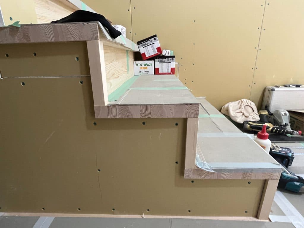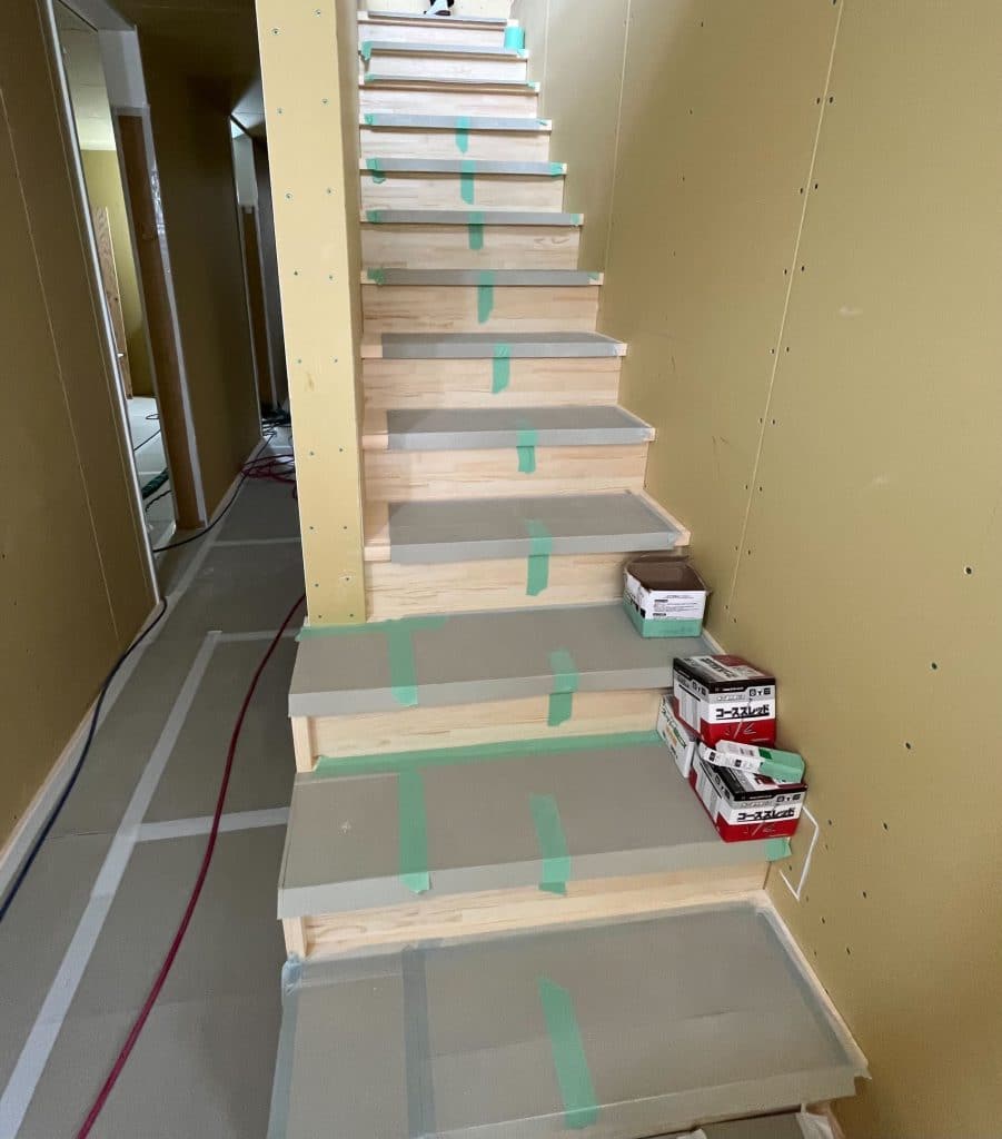 縦の角材は、漆喰の壁と階段の木材を見切る材になります。
