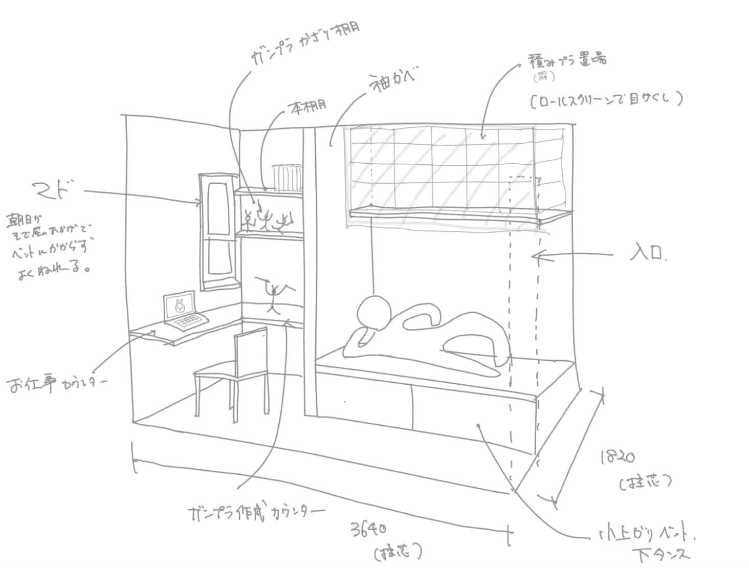 ベットと机と収納を確保しても余裕はあるし「その余った部分何に使うんだろう?」