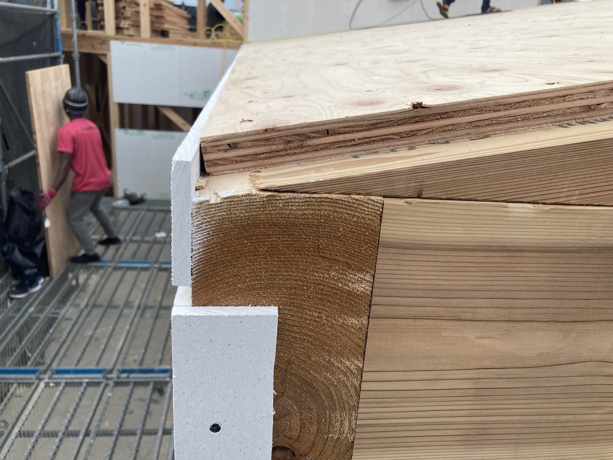せっかくの勾配天井に火打が出ない様に通常の野地板ではなく、24mmの厚さがある合板を使用しました。