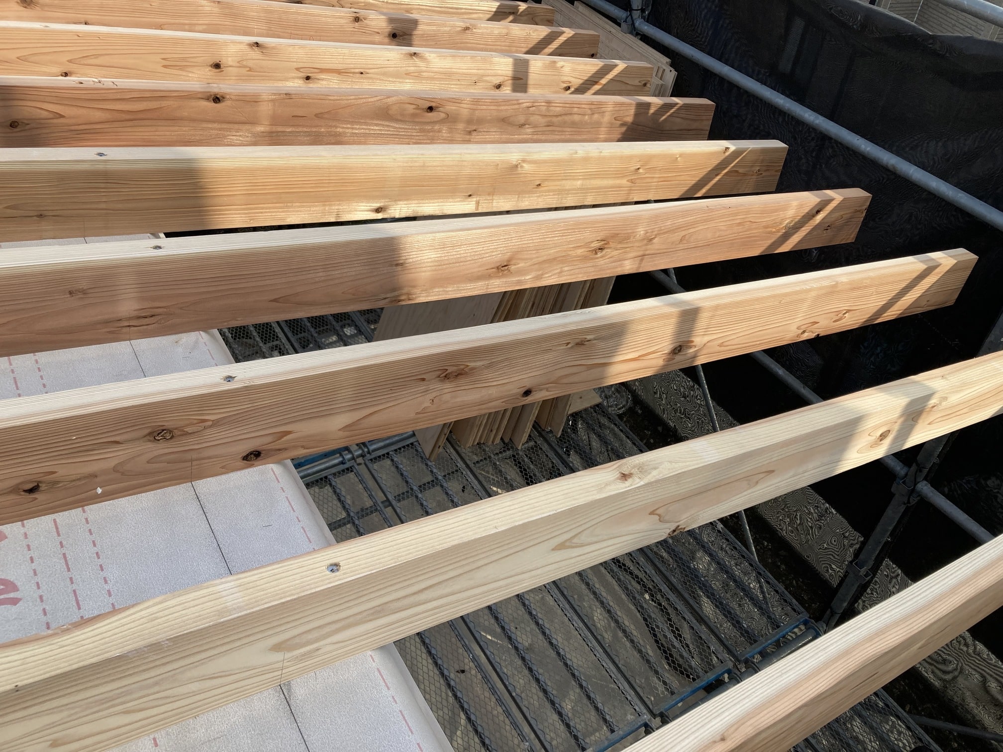 一層目の野地板に防水紙を貼って、垂木を設置します。しっかり出ている軒の出。1.8mあります。