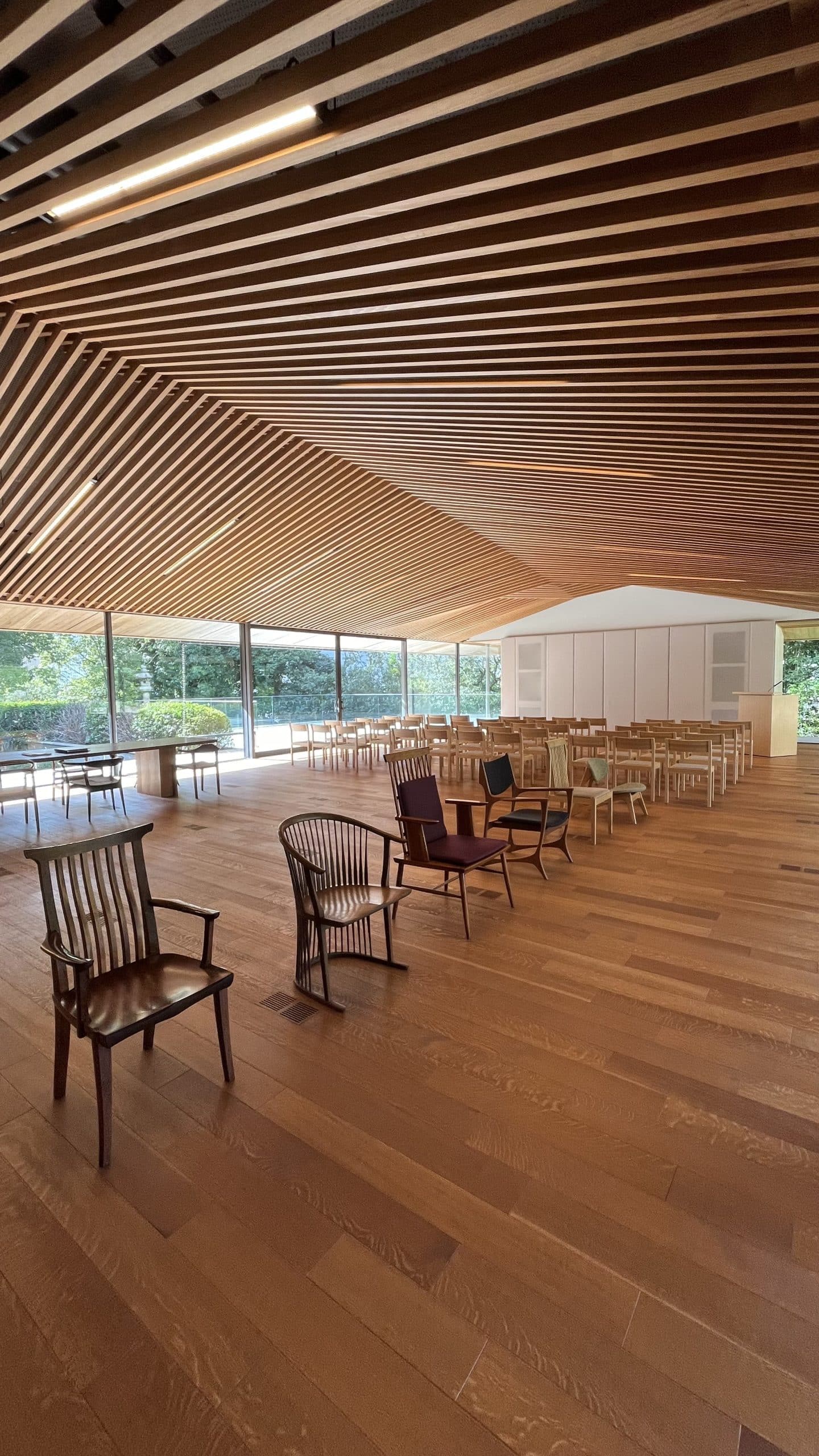木格子の勾配天井に、アンティーク漂うチェアー達がお出迎え