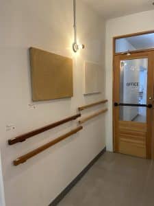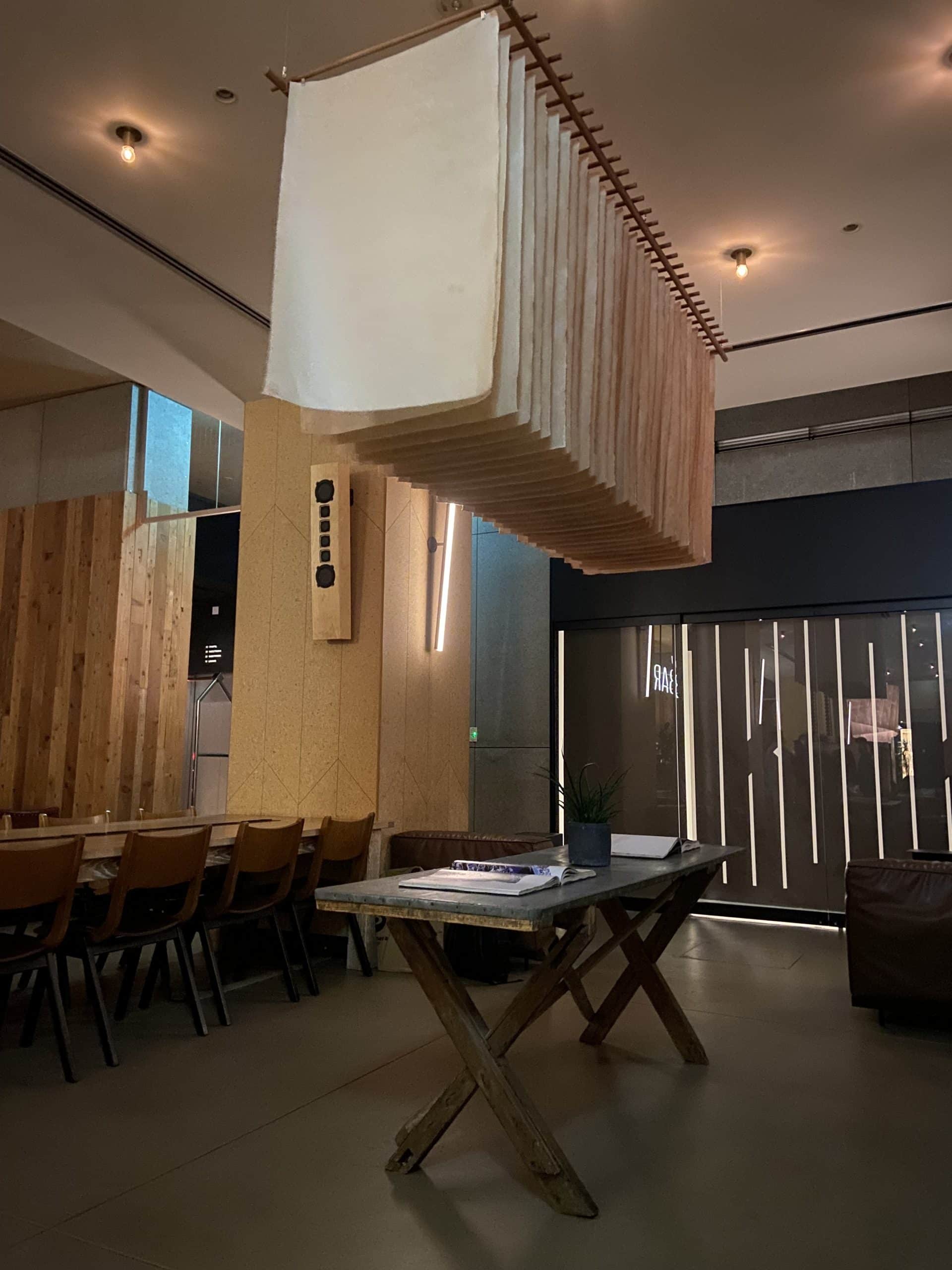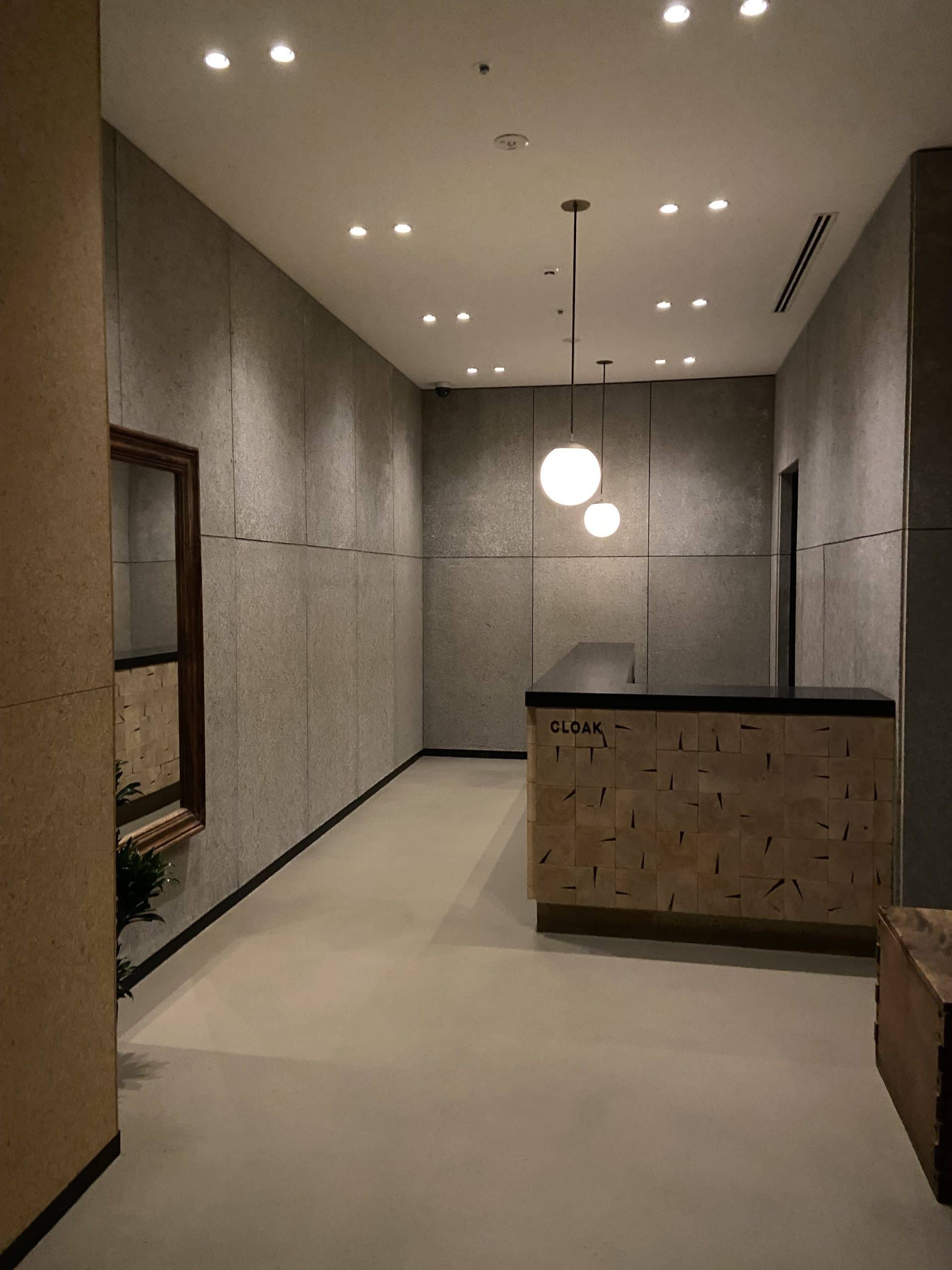 柱に貼ってある幾何学的な模様。これはコルクタイルをスリットを開けて貼って表現しています。手触りも柔らかくすごく素敵でした。