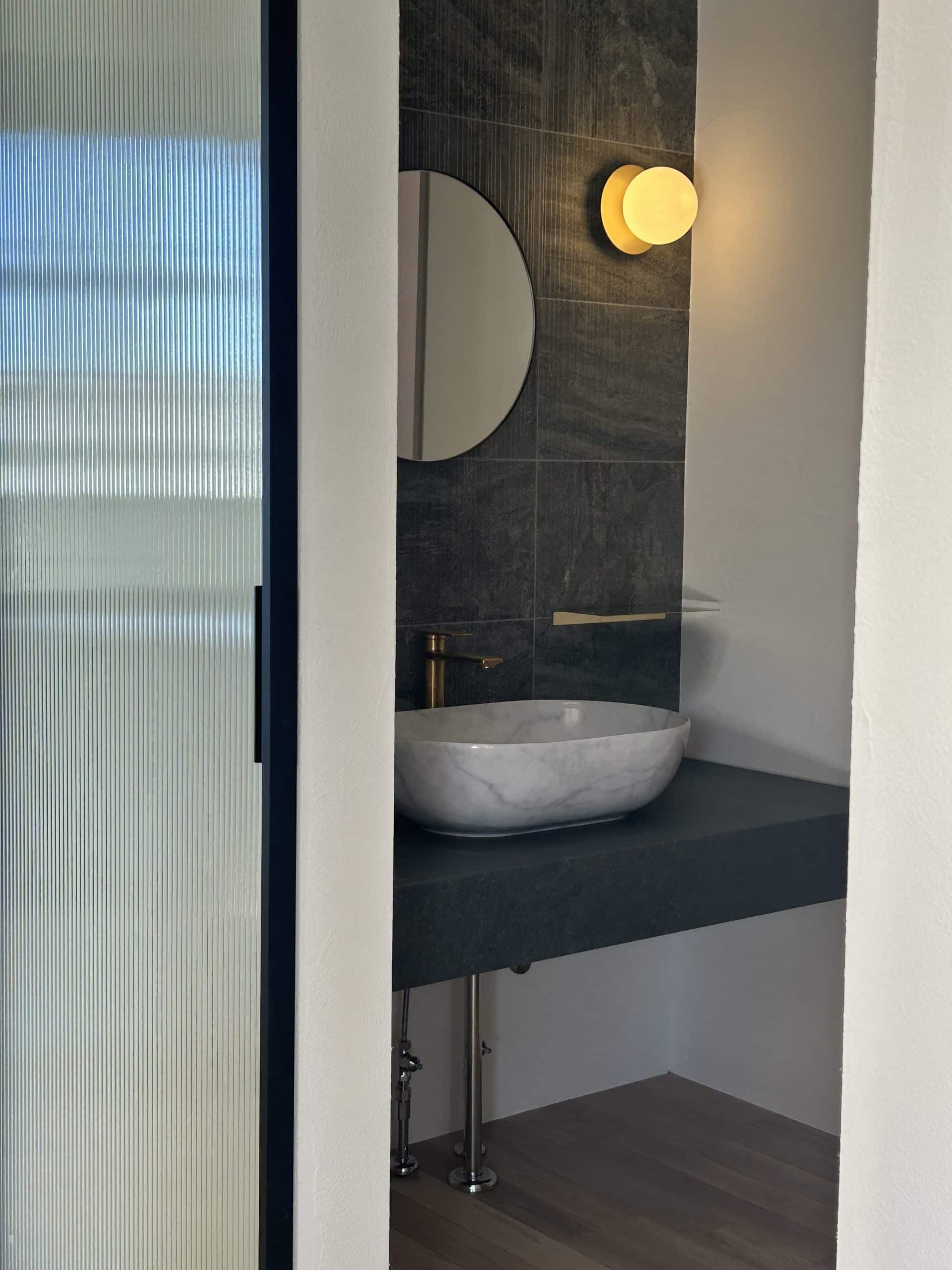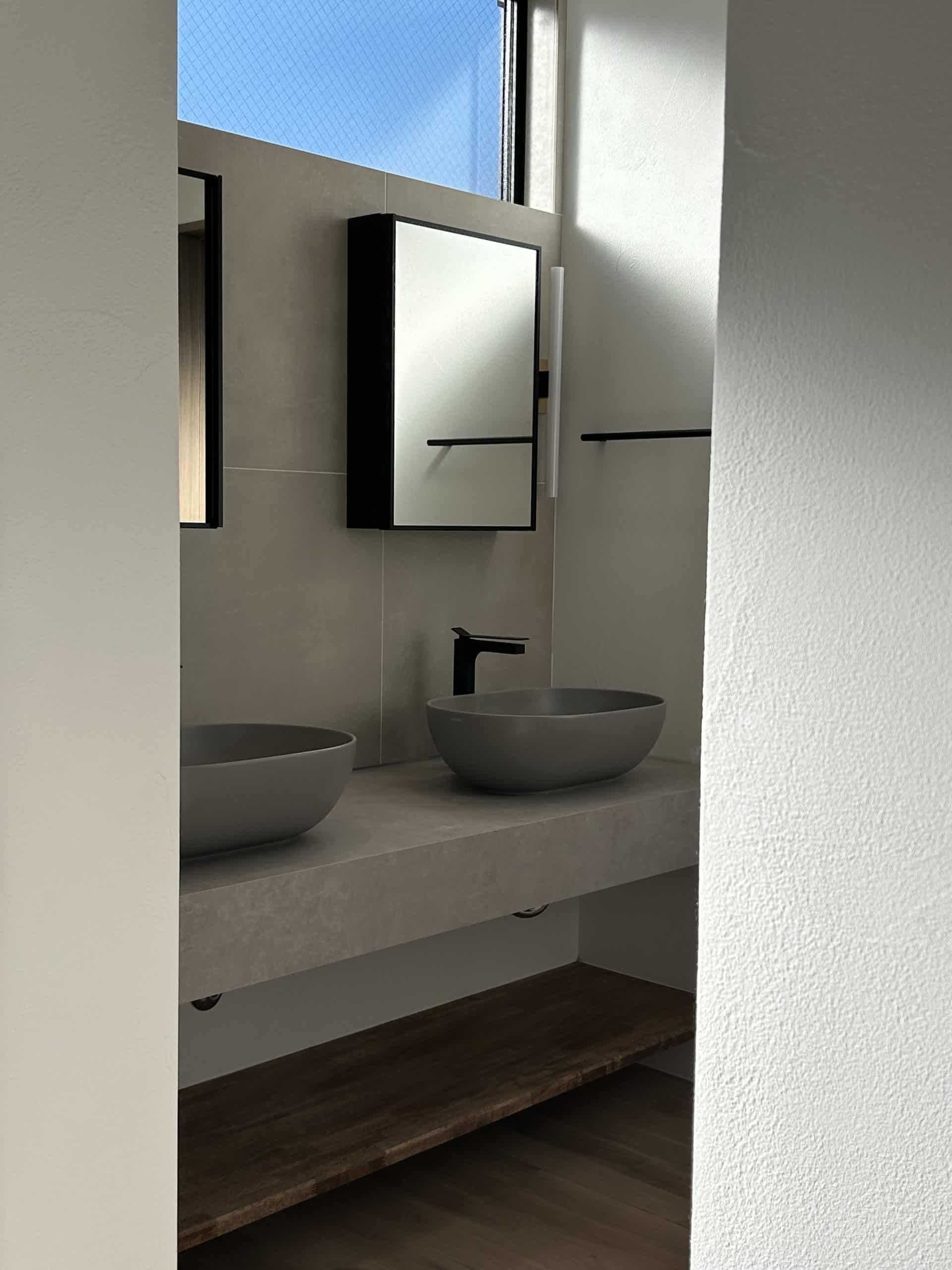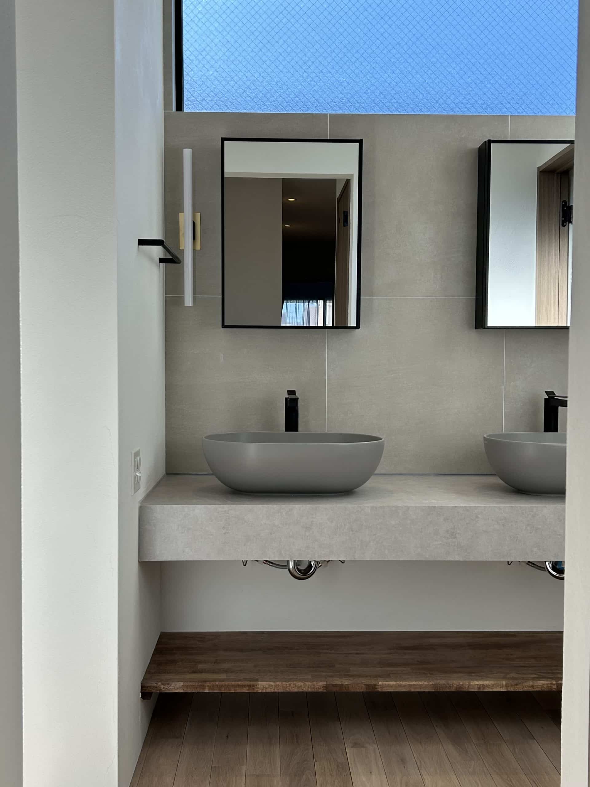 こちらは、1階とは雰囲気を変えてダークトーンでまとめた洗面スペース。